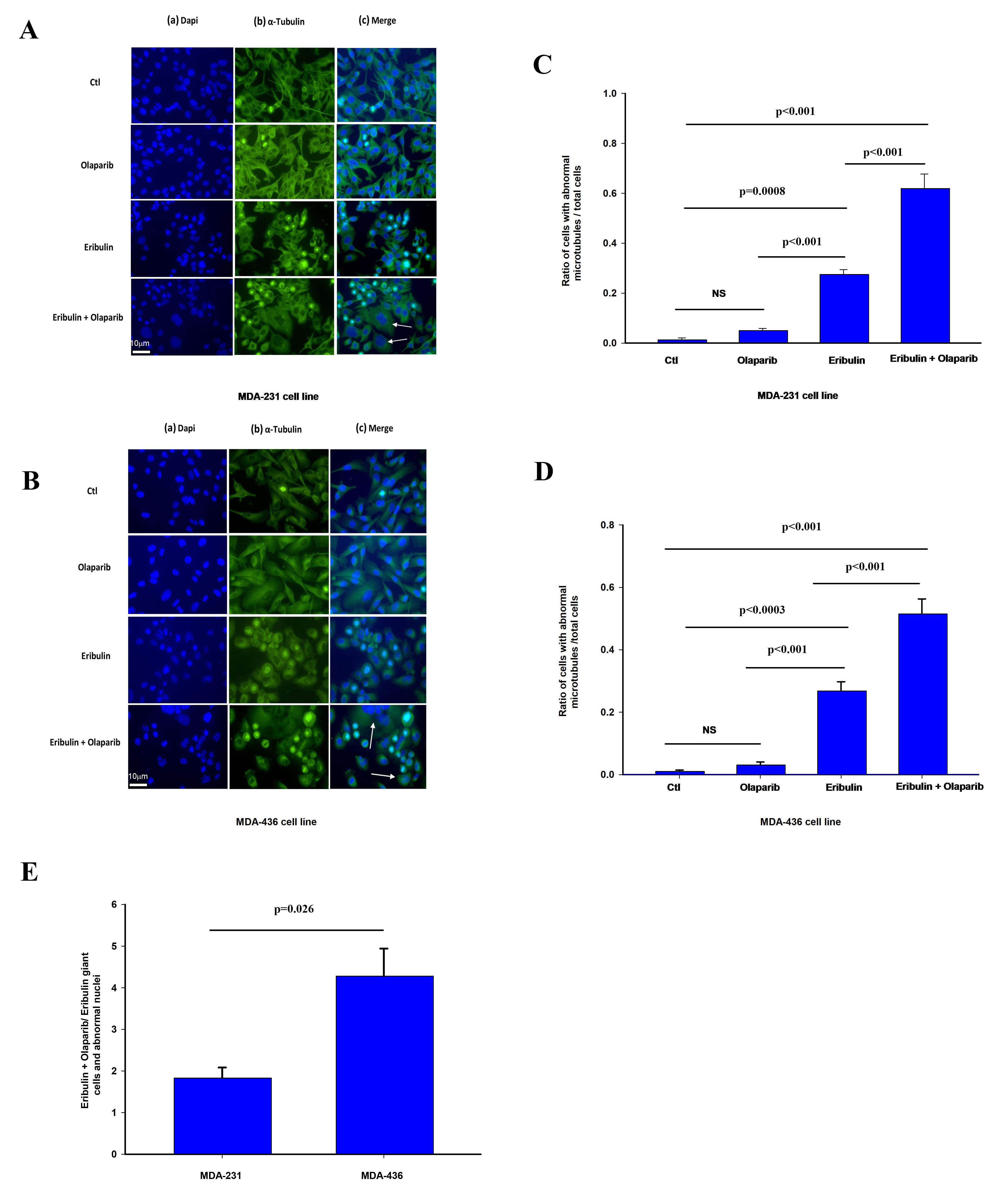 The effect of olaparib on eribulin microtubule depolarization was significantly more pronounced in MDA-436 cells with respect to MDA-231 cells (Fig. 4E). We observe a similar effect by these treatments in the frequency of cells with abnormally looking nucleus in shape and size such as giant cells shown in Fig. 4 (Supplementary Fig. 3A,B).