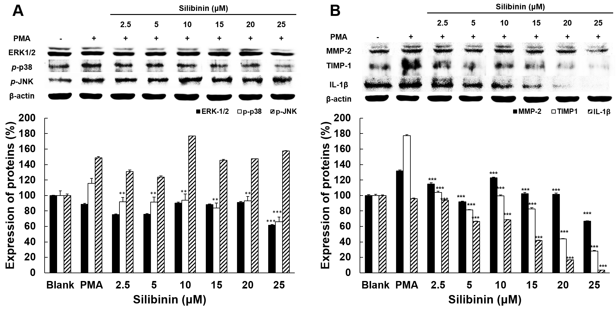 PMA-stimulated HT1080 cells to induce MMPs expression. The silibinin at 2.5, 5,