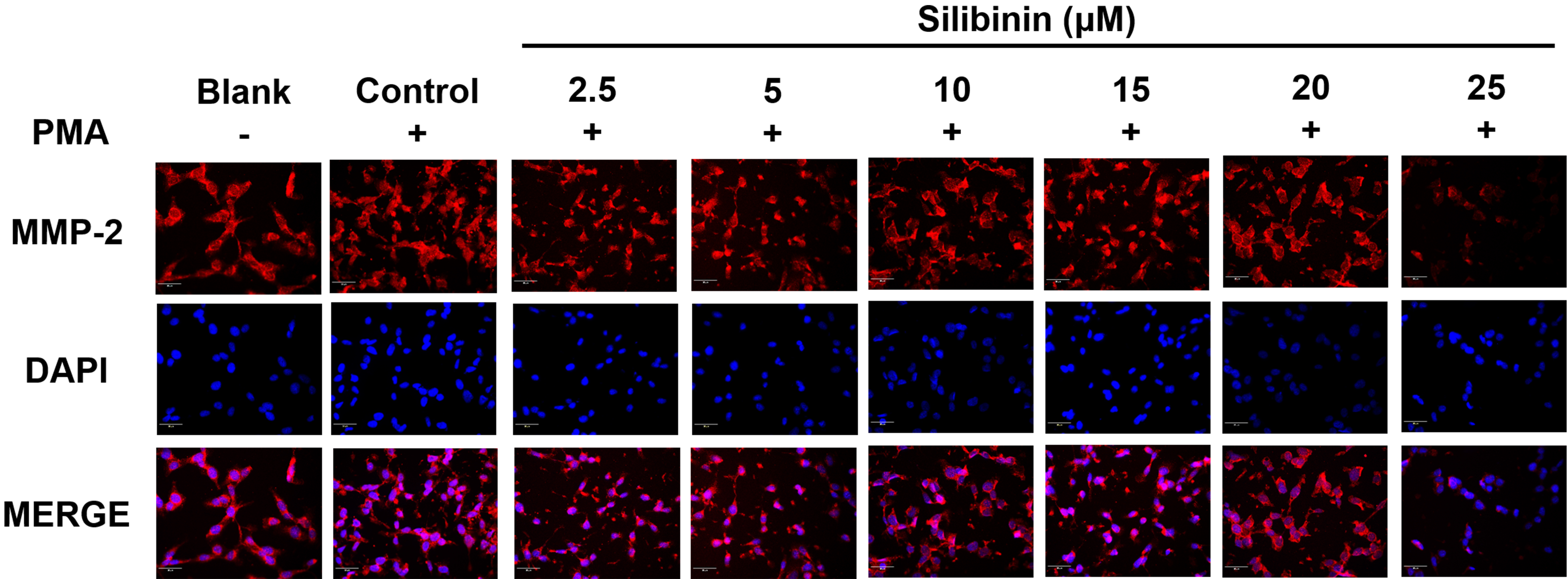 HT1080 cells were cultured in a slide chamber at 37 °C for 24 hours. After treatment with each concentration of silibinin, for 1 h, PMA at 1 ng/mL was added and incubated for 24 h. After fixing with 10% formalin for 15 min, the cells were permeabilized with phosphate-buffered saline (PBS) containing 0.5% of Tween 20 (PBS T-20) for 30 min and washed 3 times with 0.1% PBS T-20. After blocking with 5% of donkey normal serum, primary antibodies (MMP-2) were added for 2 h. Then, after washing 3 times for 5 min each with 0.1% PBS T-20, secondary antibodies (donkey anti-goat conjugated CY3, donkey anti-mouse conjugated CY3, donkey anti-rabbit conjugated FITC) were added for 1 h. Then, after washing them, the slides were exposed to DAPI reagent for nuclei staining and observed with the iRiS Digital Cell Imaging System (Logos Biosystems, Gyeonggi-do, Korea). All reagents were purchased from Sigma Chemical Co. (St. Louis, MO, USA).