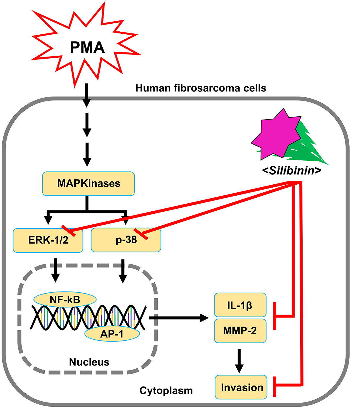 Fig. 7.Schematic diagram for the effect of silibinin on invasion and metastasis of HT1080 cells stimulated by PMA.