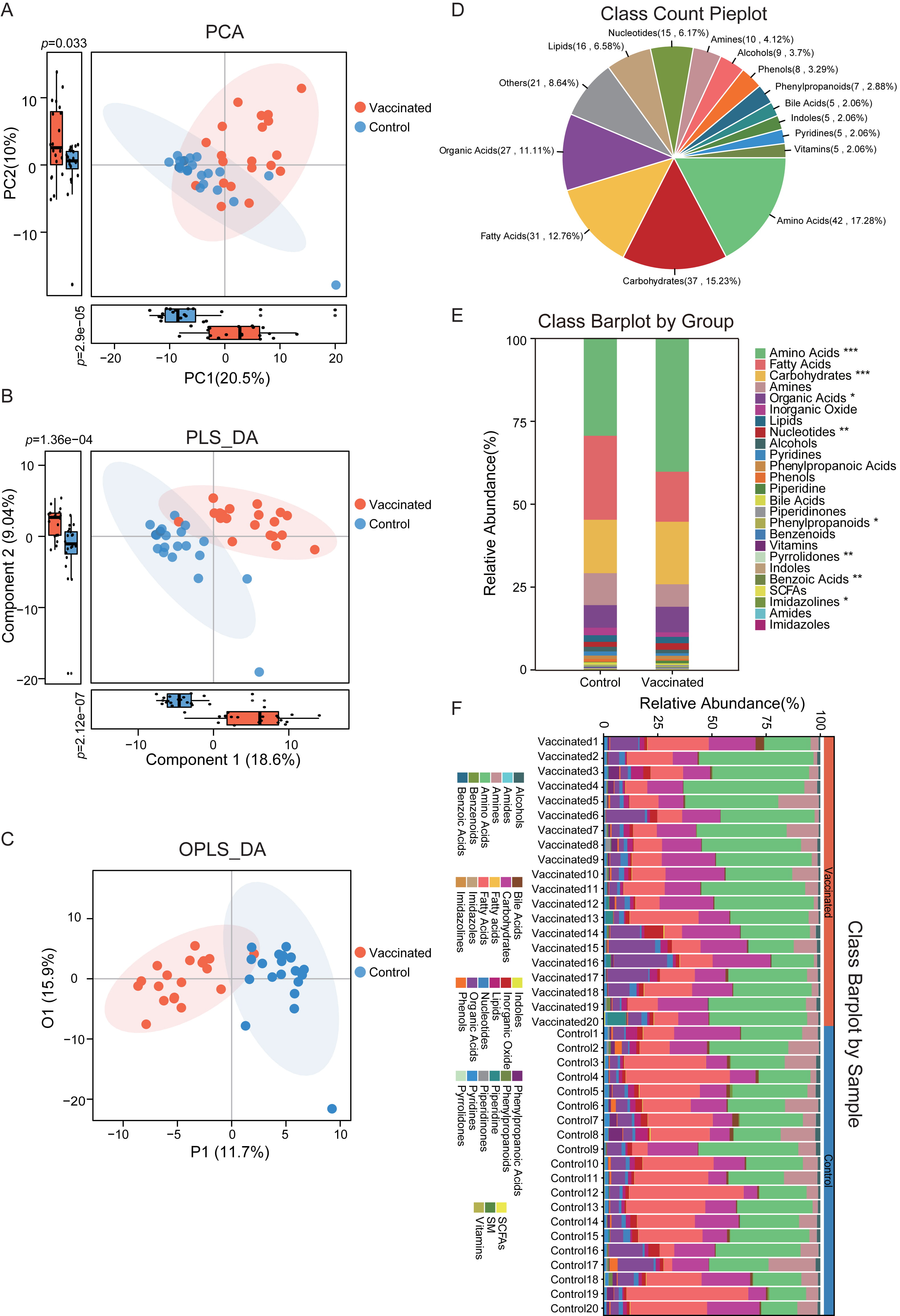The composition and percentage of varied fecal metabolite class in vaccinated