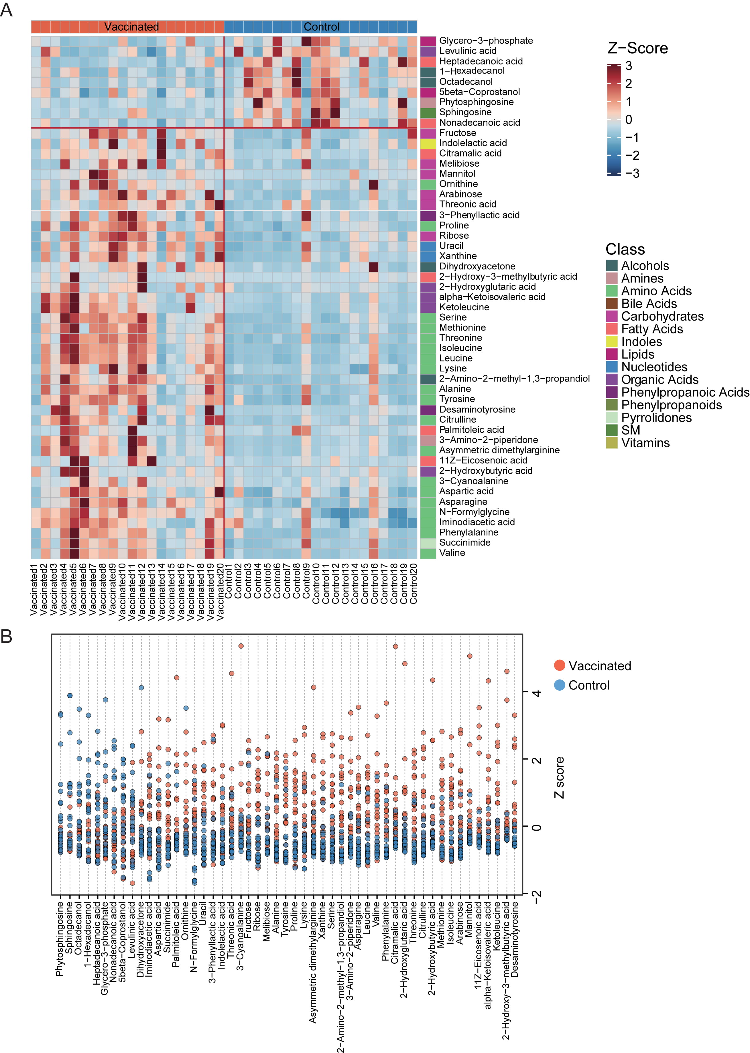 Fig. 4.The distribution of fecal metabolites with significant difference between vaccinated and control group. (A) Heatmap for the significantly shifted metabolites in feces samples of individuals receiving vaccines. The abundance of each metabolite was normalized into Z score. The class of each metabolite was shown in the right of the heatmap. (B) Z-Score plot of varied metabolic biomarkers between groups. The z-score value of 9 metabolites (phytosphingosine, sphingosine, octadecanol, 1-hexadecanol, heptadecanoic acid, glycero-3-phosphate, nonadecanoic acid, 5 beta-coprostanol, levulinic acid) was abundant in the control group, and the z-score of 42 metabolites was enriched in the vaccinated group.