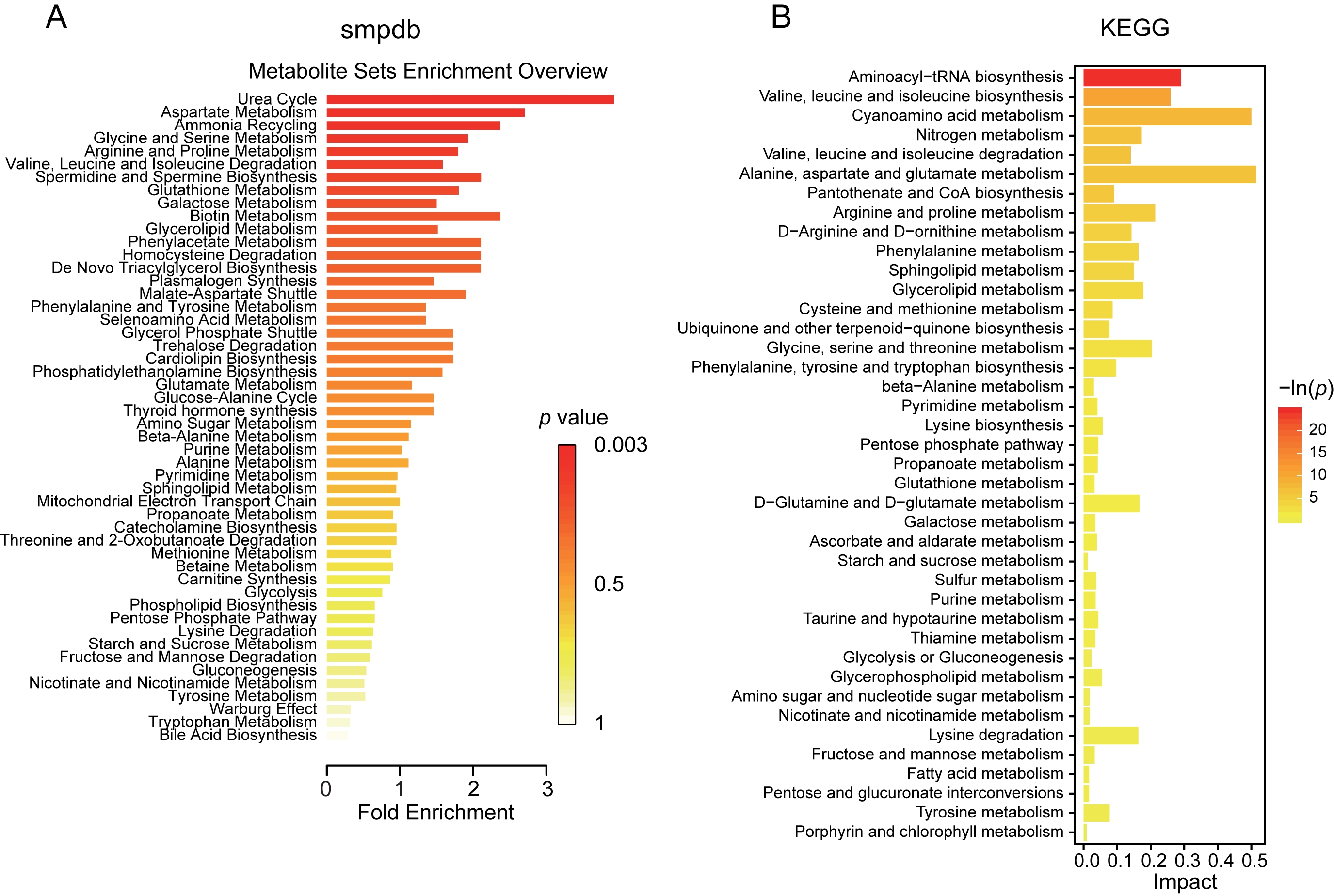 Fig. 5.Potential functional metabolic pathways of the altered metabolites between vaccinated and control group. (A) Pathway enrichment analysis and bar plot based on all the altered metabolites was performed using pathway-associated metabolite sets SMPDB. (B) The KEGG pathway terms identified according to the varied metabolites in the vaccinated group were described in the bar plot. KEGG, Kyoto Encyclopedia of Genes and Genomes; SMPDB, Small Molecule Pathway Database.