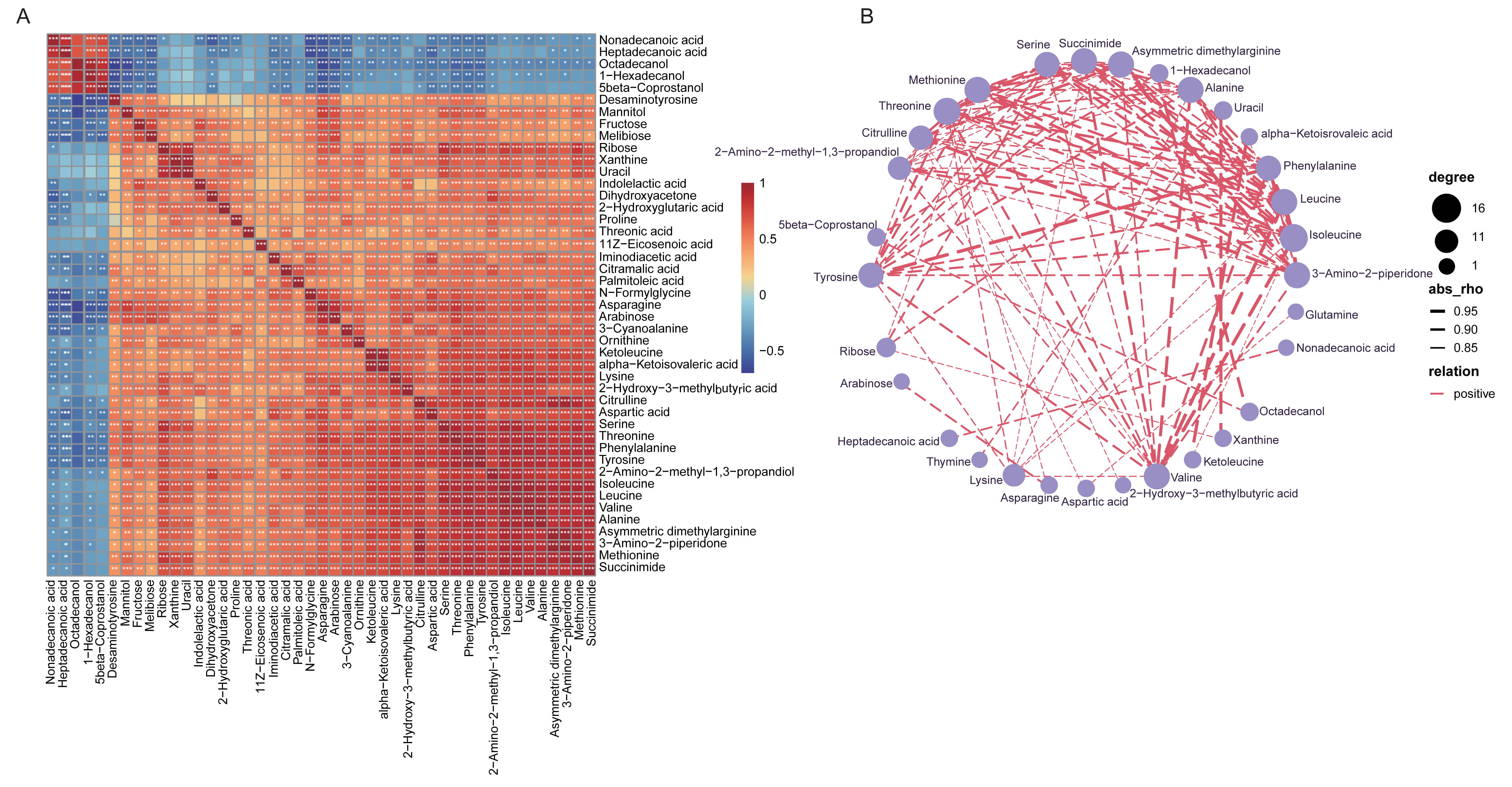 The significant correlations between different metabolic compositions were determined, and Fig. 6A described the positive or negative relationship of each metabolites. Extremely apparent relevance was detected in the majority metabolites with each other, suggesting the shifts by vaccines treatment might be collaborative. The co-occurrence network of all the varied fecal metabolites with Spearman’s correlation coefficients higher than 0.8 was further identified, and all the association were positive (Fig. 6B). For instance, 2-hydroxy-3-methylbutyric acid was positively linked to isoleucine, leucine, phenylalanine, alanine, succinimide and so on; and 4-hydroxycinnamic acid was positively associated with phenylalanine, leucine and isoleucine.