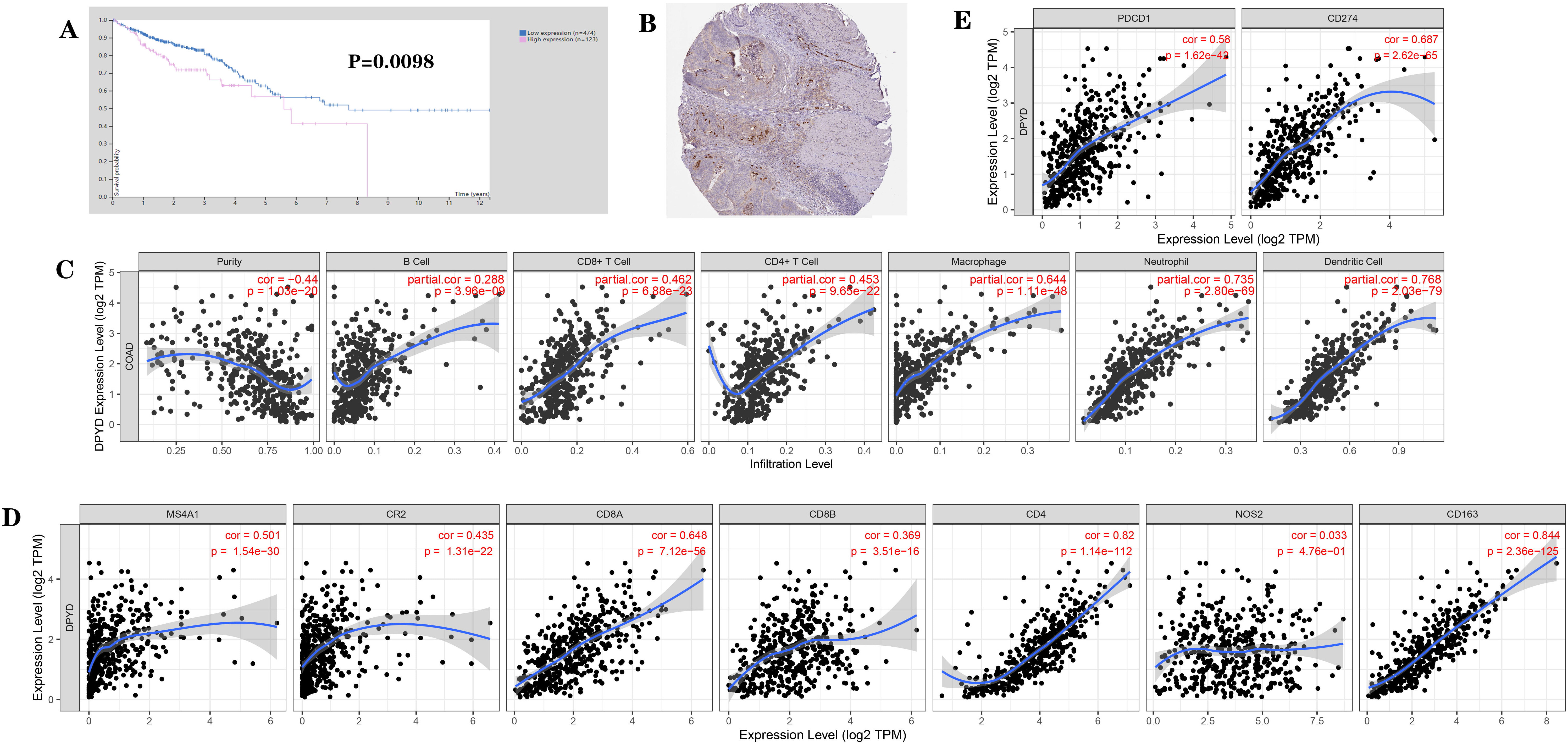 Expression of DPD and its association with the prognosis of patients with cancer based on bioinformatics analysis (from the HPA and the TIMER database). (A) Association of DPD expression with prognosis of patients with colon cancer. (B) Localization of DPD expression in colon cancer tissues. (C) Correlation between DPD expression and immune cell phenotypes: DPD expression positively and significantly correlated with the presence of CD4+ T cells, CD8+ T cells, B cells, neutrophils, macrophages, and dendritic cells. (D) Correlation between DPD expression and immune markers: DPD expression positively and significantly correlated with T cell markers (CD8A, CD8B, and CD4), B cell markers (MS4A1, CR2), and M2 macrophage markers (CD163), but did not significantly correlate with the M1 macrophage marker NOS2. (E) Correlation between DPD expression and immune checkpoints: DPD expression significantly and positively correlated with that of immune checkpoints PD-1 (PDCD1) and PD-L1 (CD274). p < 0.05 was considered as significant.