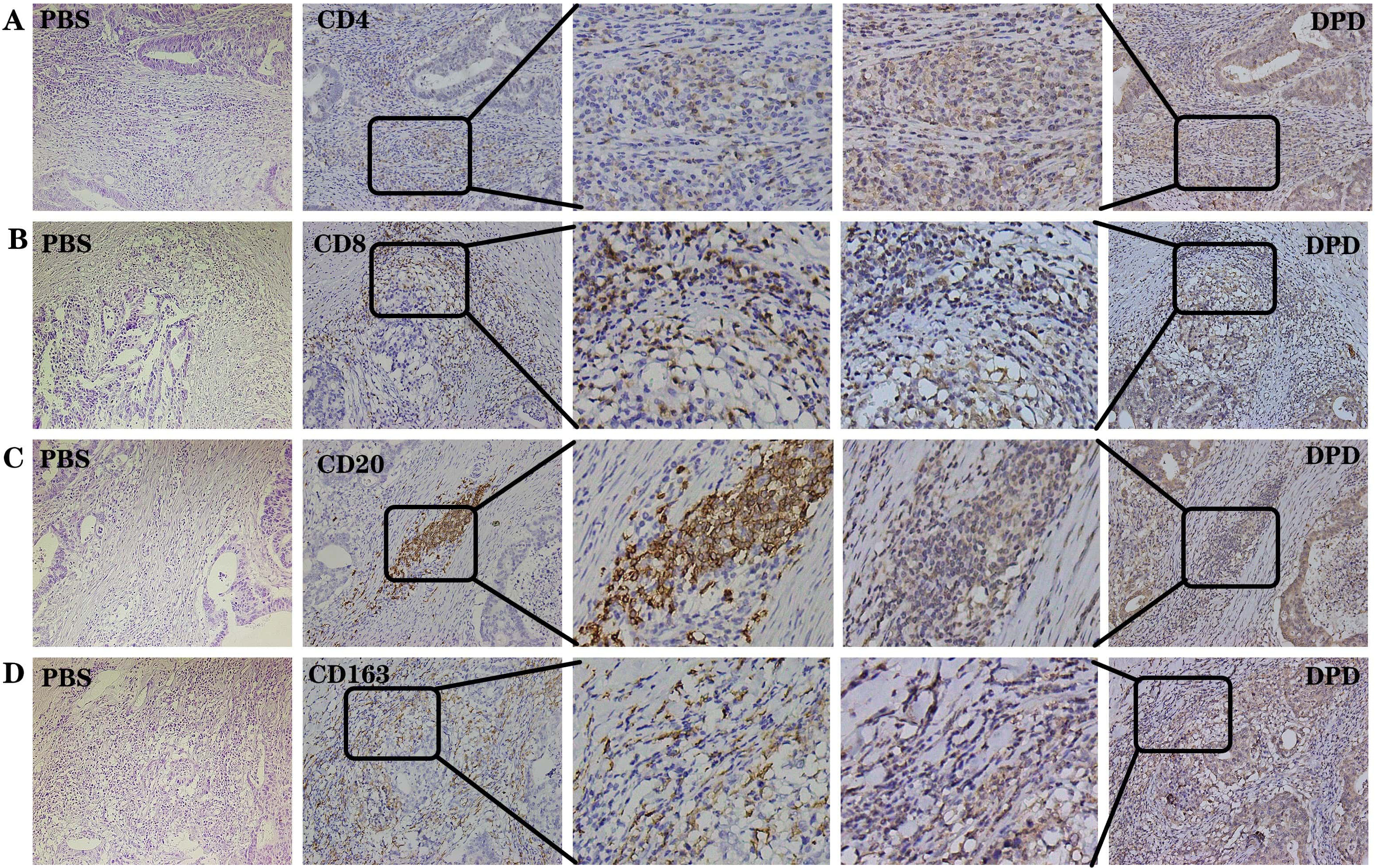 DPD and immune-related indexes were positively expressed in the same region in the 30 samples with the strongest immune infiltration. (A) Negative control, PBS. Positive control, CD4 and DPD. (B) Negative control, PBS. Positive control, CD8 and DPD. (C) Negative control, PBS. Positive control, CD20 and DPD. (D) Negative control, PBS. Positive control, CD163 and DPD. The same sample was sliced continuously under the same field of view. Magnification 200×. Box marked area: Enlarged view of positive expression of DPD and immune-related indicators in the same area.