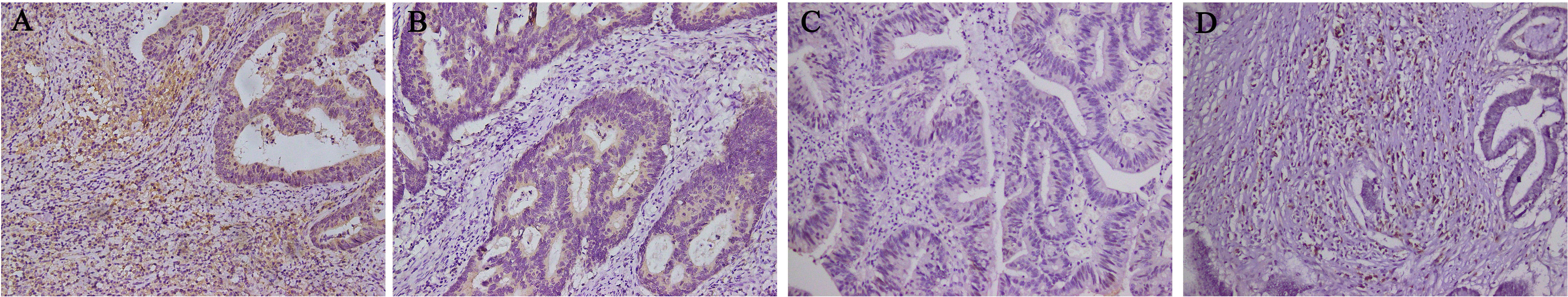 Basis of groupings according to the localization of DPD expression (n = 219). (A) DPD expression in tumor cells and immune cells (n = 80). (B) DPD expression in tumor cells but not in immune cells (n = 45). (C) DPD was not expressed in tumor cells and immune cells (n = 91). (D) DPD was not expressed in tumor cells but was in immune cells (n = 3). Magnification 200×.