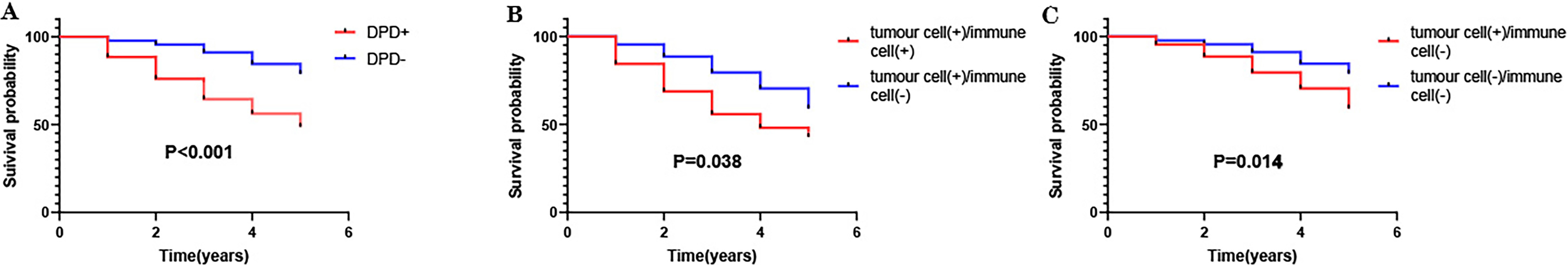 Association of DPD expression with survival of patients with colon cancer (n = 216). (A) Compared with the DPD-positive group (n = 125), the prognosis of the DPD-negative group (n = 91) was better. (B) Compared with the cancer cell + and immune cell + group (n = 80), the cancer cell + and immune cell – group (n = 45) experienced better prognosis. (C) Compared with the cancer cell + and immune cell – group (n = 45), the cancer cell – and immune cell – group (n = 91) experienced better prognosis.