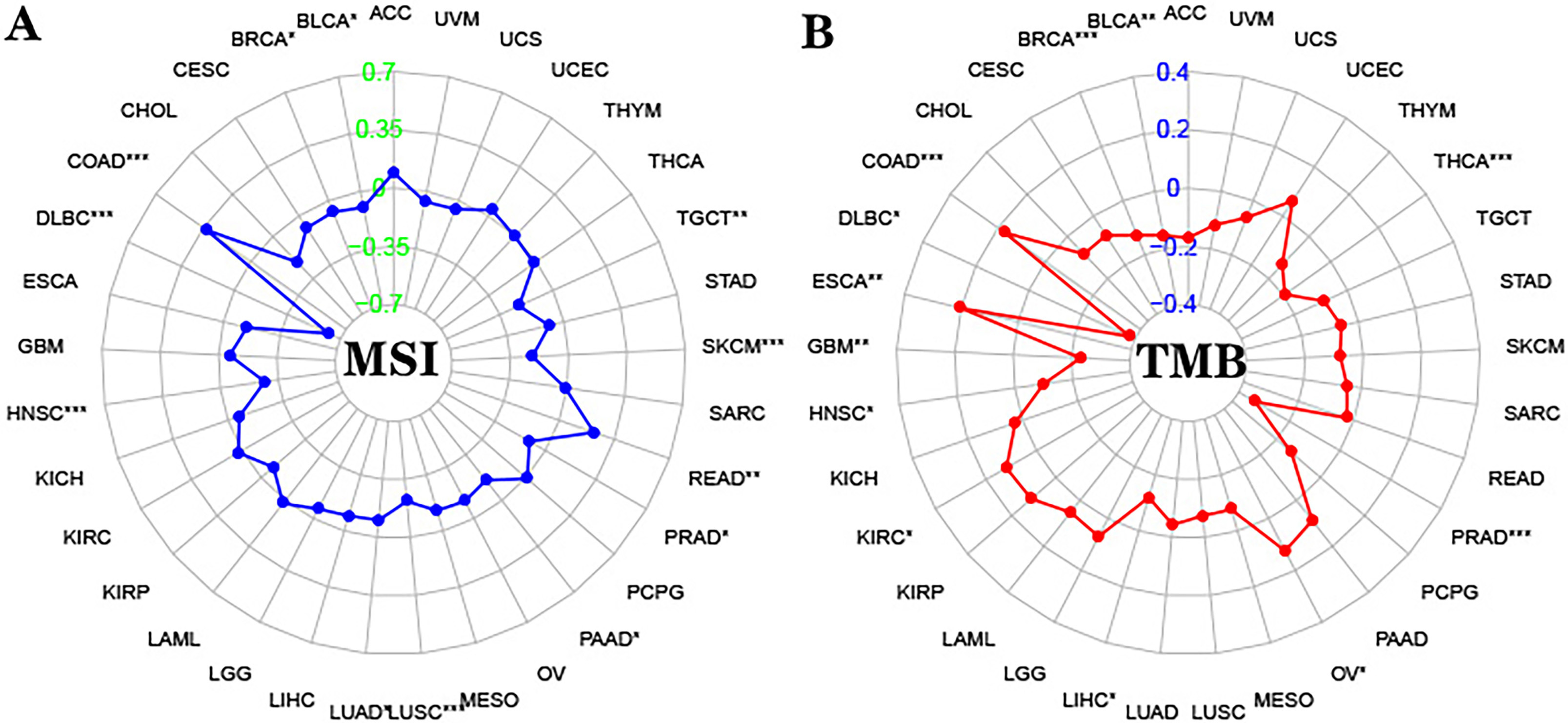 Correlation between DPD and MSI/TMB. (A) Correlation between DPD expression and MSI in 33 types of cancer (DPD and MSI significantly and positively correlated in COAD). (B) Correlation between DPD expression and TMB in 33 types of cancer (DPD and TMB significantly and positively correlated in COAD). Abbreviations: ACC, Adrenocortical carcinoma; BLCA, Bladder Urothelial Carcinoma; BRCA, Breast invasive carcinoma; CESC, Cervical squamous cell carcinoma and endocervical adenocarcinoma; CHOL, Cholangiocarcinoma; COAD, Colon adenocarcinoma; DLBC, Lymphoid Neoplasm Diffuse Large B-cell Lymphoma; ESCA, Esophageal carcinoma; GBM, Glioblastoma multiforme; HNSC, Head and Neck squamous cell carcinoma; KICH, Kidney Chromophobe; KIRC, Kidney renal clear cell carcinoma; KIRP, Kidney renal papillary cell carcinoma; LAML, Acute Myeloid Leukemia; LGG, Brain Lower Grade Glioma; LIHC, Liver hepatocellular carcinoma; LUAD, Lung adenocarcinoma; LUSC, Lung squamous cell carcinoma; MESO, Mesothelioma; OV, Ovarian serous cystadenocarcinoma; PAAD, Pancreatic adenocarcinoma; PCPG, Pheochromocytoma and Paraganglioma; PRAD, Prostate adenocarcinoma; READ, Rectum adenocarcinoma; SARC, Sarcoma; SKCM, Skin Cutaneous Melanoma; STAD, Stomach adenocarcinoma; TGCT, Testicular Germ Cell Tumors; THCA, Thyroid carcinoma; THYM, Thymoma; UCEC, Uterine Corpus Endometrial Carcinoma; UCS, Uterine Carcinosarcoma; UVM, Uveal Melanoma (*: p < 0.05, * *: p < 0.01, * * *: p < 0.001).