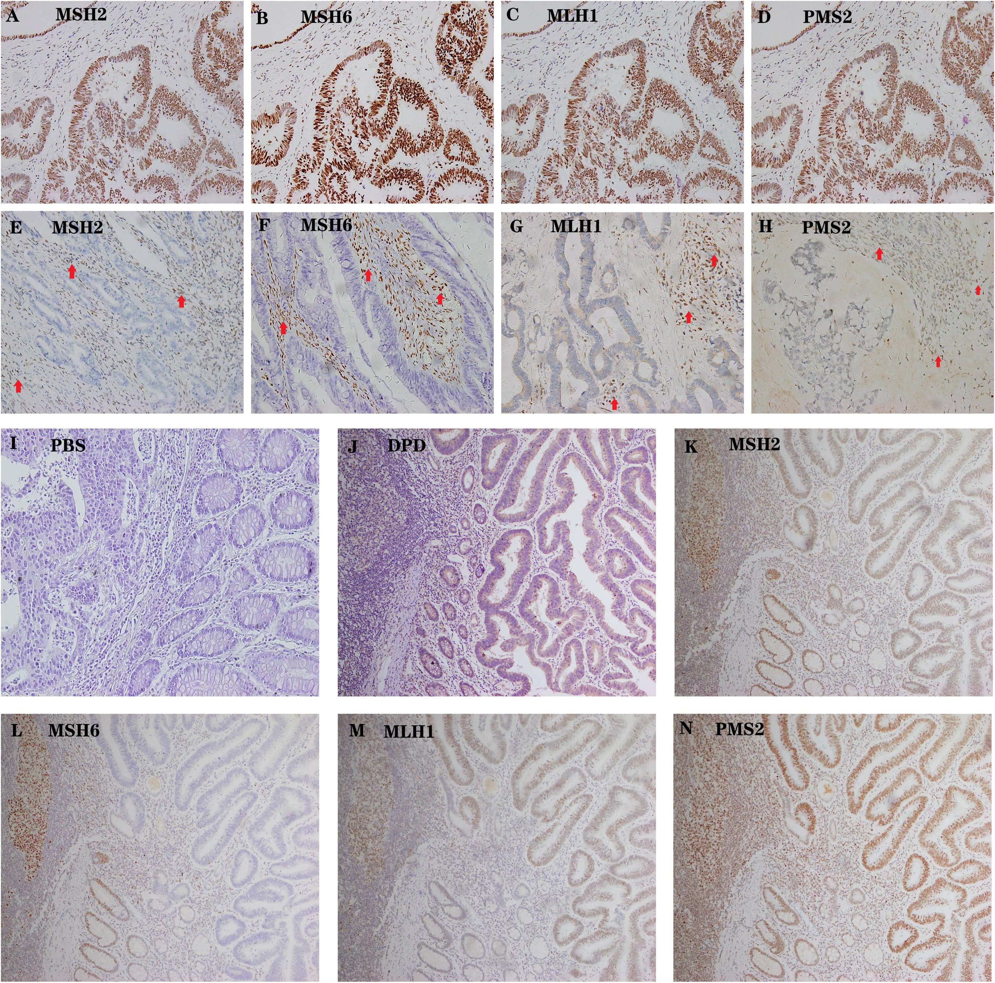 Representative examples of MSS AND MSI colon cancer. (A–D) High expression of MSH2, MSH6, MLH1 and PMS2 in tumor cells as well as the internal positive control (lymphocytes). Magnification 200×. (E–H) Low expression of MSH2, MSH6, MLH1 and PMS2 in tumor cells, while high expression in the internal positive control (lymphocytes with red arrow). Magnification 200×. (I) Negative control, PBS. Magnification 200×. (J–N) A Representative example of DPD-positive patients with low MSH6 expression. Magnification 100×. [(J) High expression of DPD. (K) High expression of MSH2 in tumor cells as well as the internal positive control (lymphocytes and normal colonic mucosa). (L) Low expression of MSH6 in tumor cells but high expression in the internal positive control (lymphocytes and normal colonic mucosa). (M) High expression of MLH1 in tumor cells as well as the internal positive control (lymphocytes and normal colonic mucosa). (N) High expression of PMS2 in tumor cells as well as the internal positive control (lymphocytes and normal colonic mucosa).]