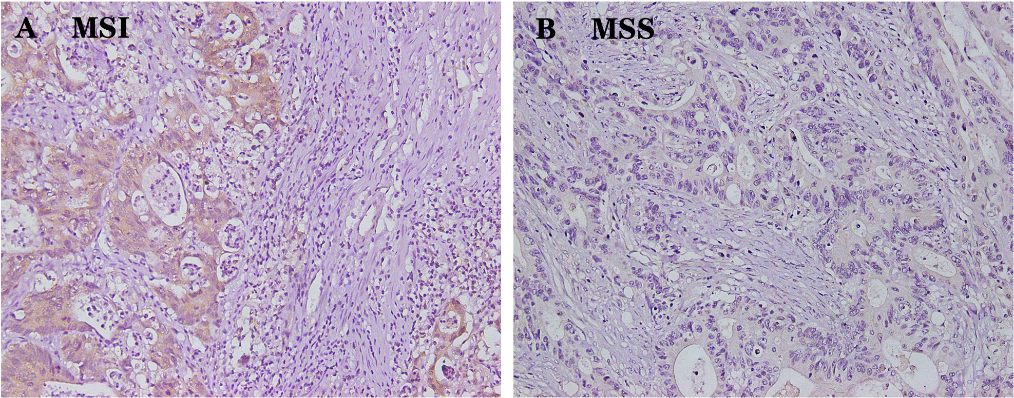 MSI was associated with increased DPD expression and increased number of immune cells (n = 219). (A) In MSI patients, DPD expression and the number of immune cells was high (The number of immune cells is higher than average). (B) In MSS patients, DPD expression and the number of immune cells was low (The number of immune cells is lower than average). Magnification 200×.