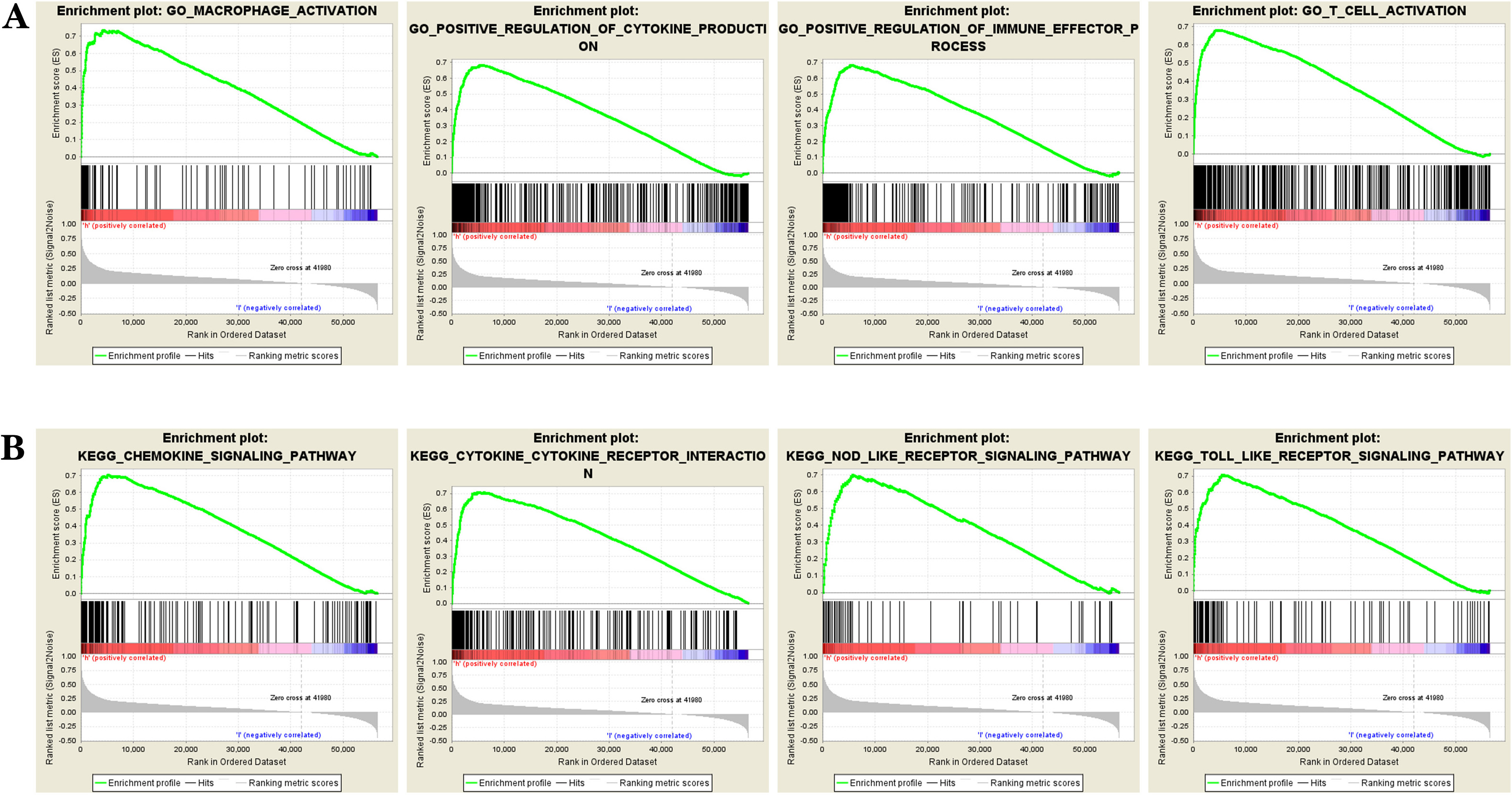 DPD enrichment analysis in colon cancer. (A) DPD is enriched in the terms “macrophage activation” and “T cells activation”, “positive regulation of immune effector process”, “positive regulation of cytokine production” and other functions. (B) DPD is enriched in the Toll-like receptor signaling pathway and chemokine signaling pathway, “cytokine-cytokine receptor interaction”, and “NOD-like receptor signaling pathway”. GSEA analysis identified a series of key immune-related functions and pathways. These findings suggest that DPD may affect tumor progression and prognosis through its deep involvement in tumor immunomodulation.