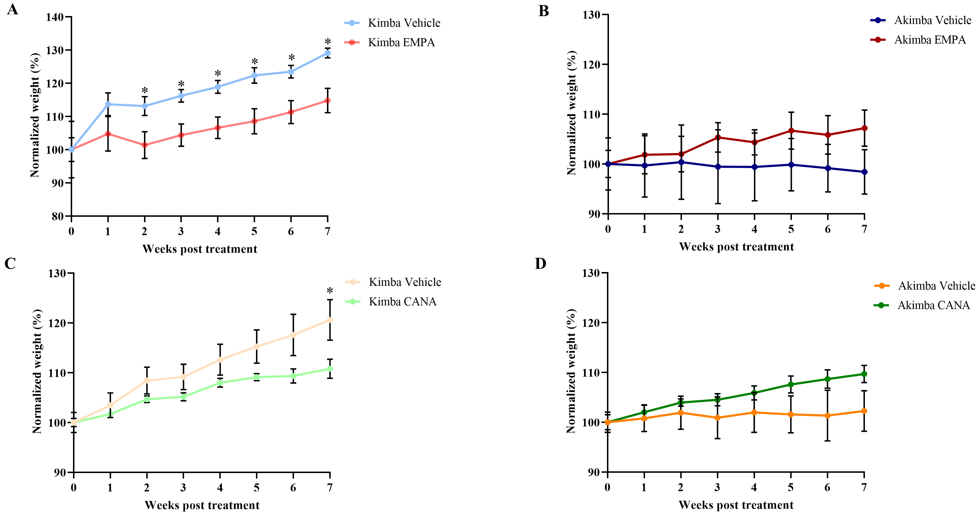 Kimba and Akimba mice treated with EMPA or CANA. Graphs show the normalized body