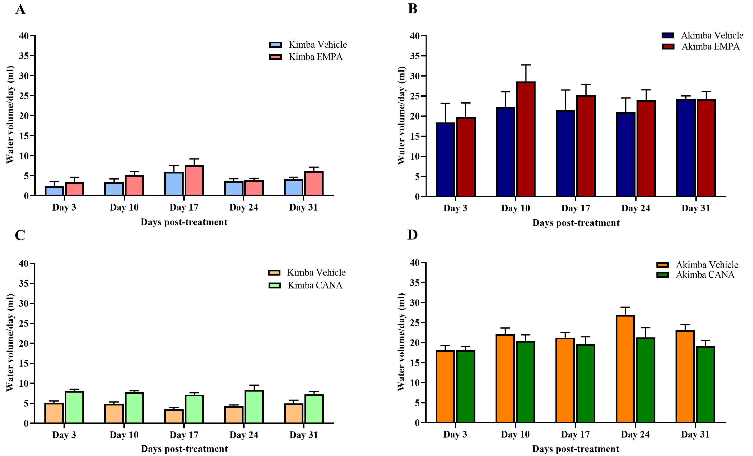 Akimba mice treated with EMPA or CANA. Graphs depict the volume of water