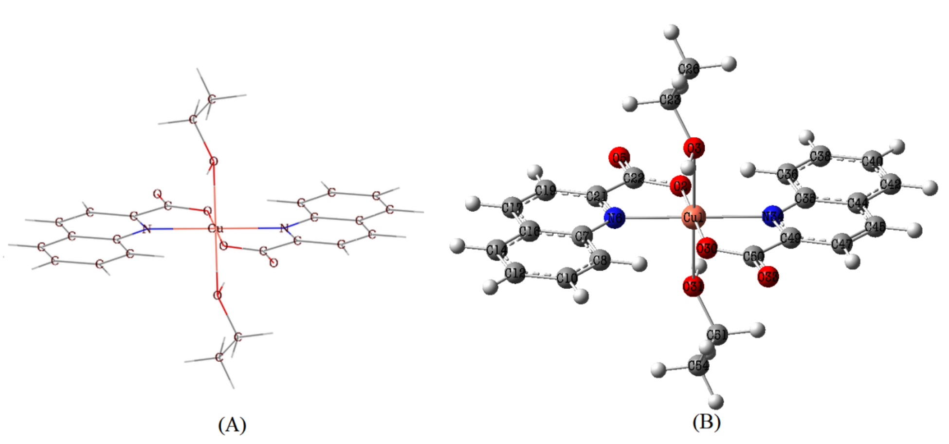 Fig. 2.Molecular structure (A) and optimized structure (B) of Trans-[Cu (quin)2(EtOH)2] molecule.