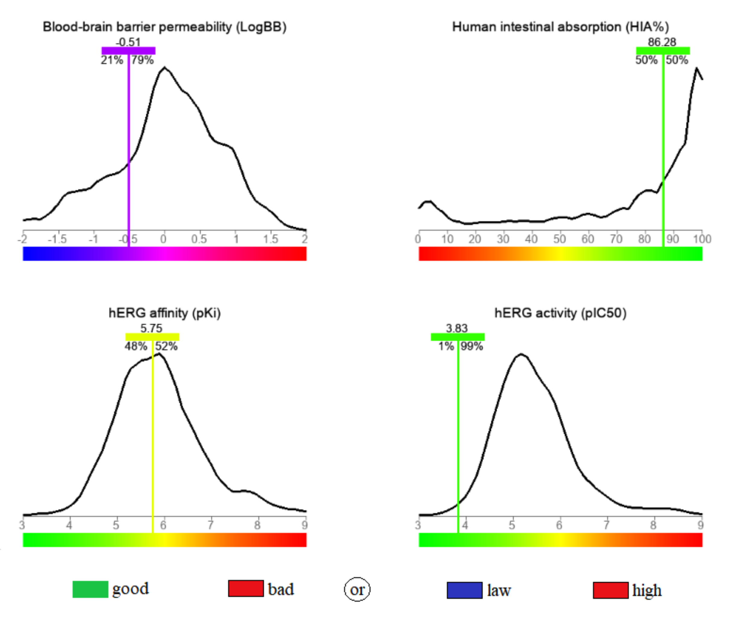 Fig. 3.The calculated blood-brain barrier permeability (BBB), human intestinal absorbance (HIA), human Ether-à-go-go-Related Gene (hERG) activity and hERG affinity for the stated compound.