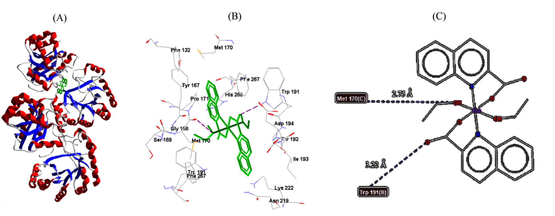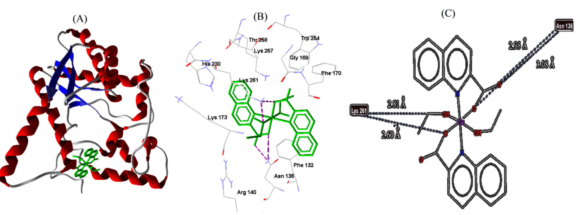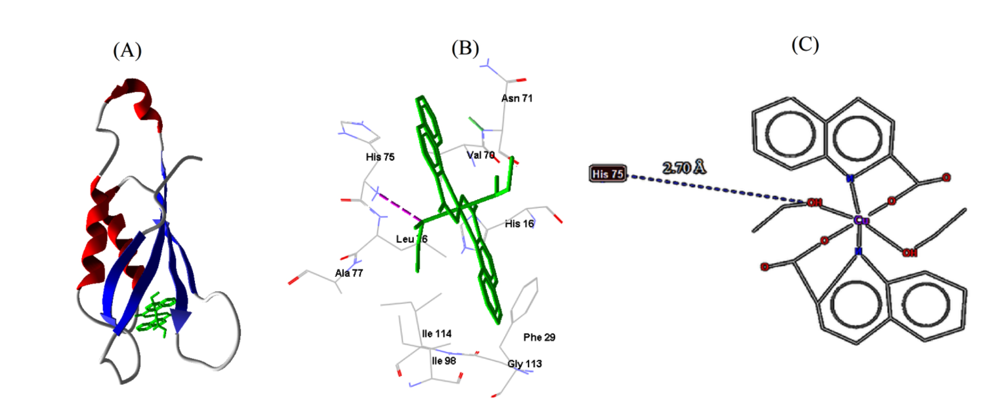Fig. 8.Cu-complex with E. coli. (A) 3D representation of Cu-complex in the protein cavity. (B) 3D representation of the interactions within the binding pocket. (C) 2D representation of the interactions with amino acid residues.