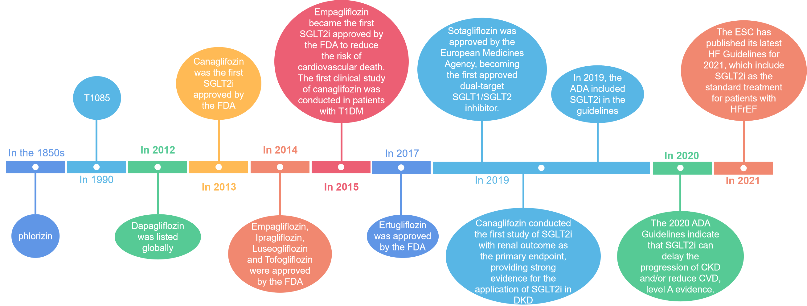 Fig. 1.The history of SGLT2i application. DKD, diabetes kidney disease; CVD, cardiovascular disease; HFrEF, heart failure with reduced ejection fraction.