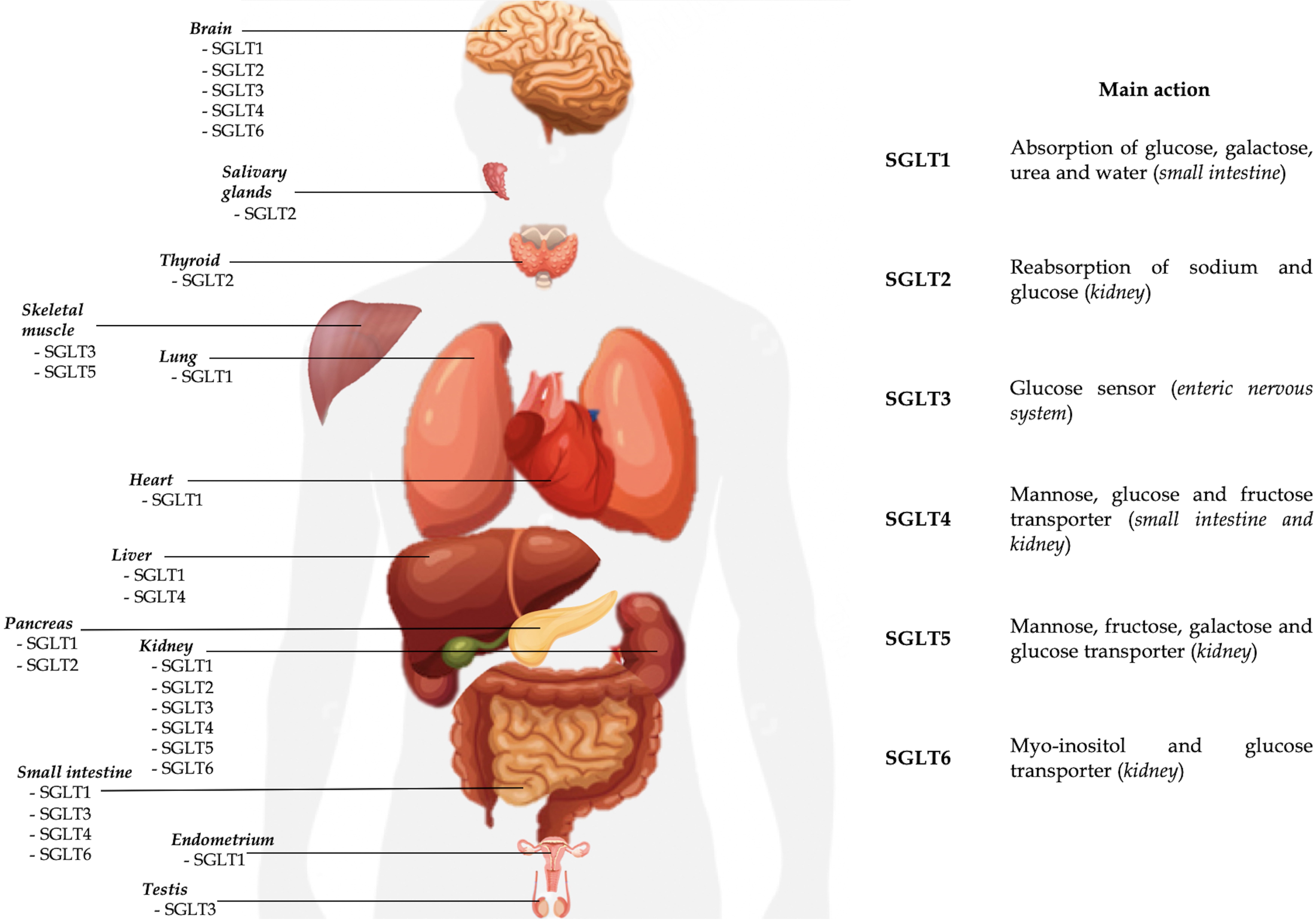SGLTs belong to a larger family of solute carriers called SLC5 (solute carrier 5 family) which includes 12 different members [1]. In fact, along with SGLT 1-6 playing the role of glucose transporters, it includes also myo-inositol (SLC5A3 and SLC5A11), iodide (SLC5A5), vitamin (SLC5A6), choline (SLC5A7) and monocarboxylate (SLC5A8 and SLC5A12) transporters. Among SGLTs, with the exception of SGLT3, these proteins are all involved in the active transport of sodium and glucose and other micromolecules (mannose, inositol, choline, iodine, galactose, fructose, biotin, short chain fatty acids) and are expressed variably in human tissues [1, 2, 4].