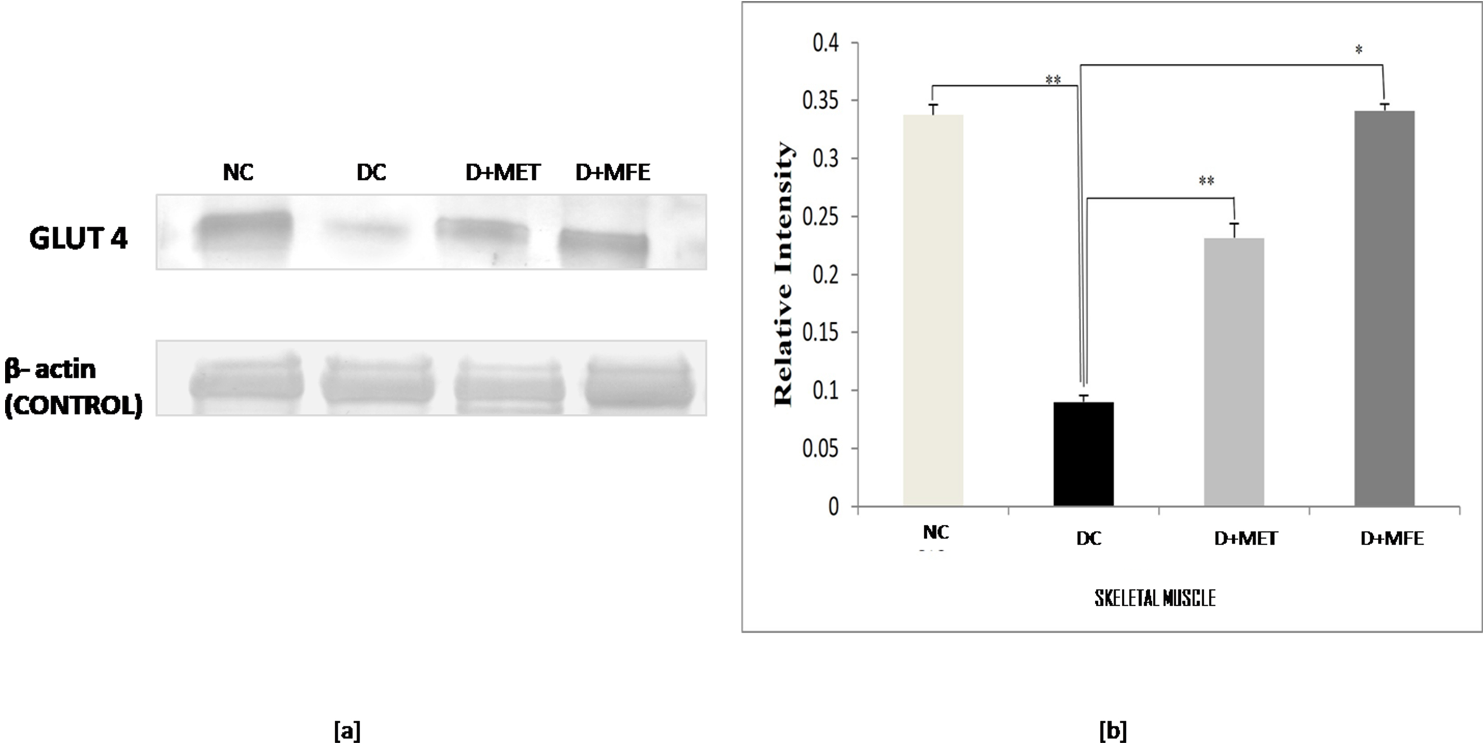 Under diabetes mellitus conditions, the glucose transporter protein GLUT4 in the cell membrane is reduced due to the lack of insulin sensitivity. This leads to decreased cell glucose uptake or hyperglycemia [38]. Insulin regulates the presence or absence of GLUT4 on the plasma membrane’s cell surface. The effect of MFE on the expression of GLUT4 protein in the skeletal muscles of diabetic mice was studied. The study found that GLUT4 expression was downregulated in diabetic mice, indicating a relative insulin deficit. In contrast, after MFE therapy, GLUT4 expression was shown to be increased and equivalent to GLUT4 expression in metformin-treated diabetic mice, indicating an increase in insulin availability in the treated groups. Increased GLUT4 protein levels would increase glucose absorption in skeletal muscle, assisting in treating hyperglycemic conditions. MFE was discovered to have an anti-hyperglycemic effect against alloxan-induced hyperglycemia, according to the study’s findings.