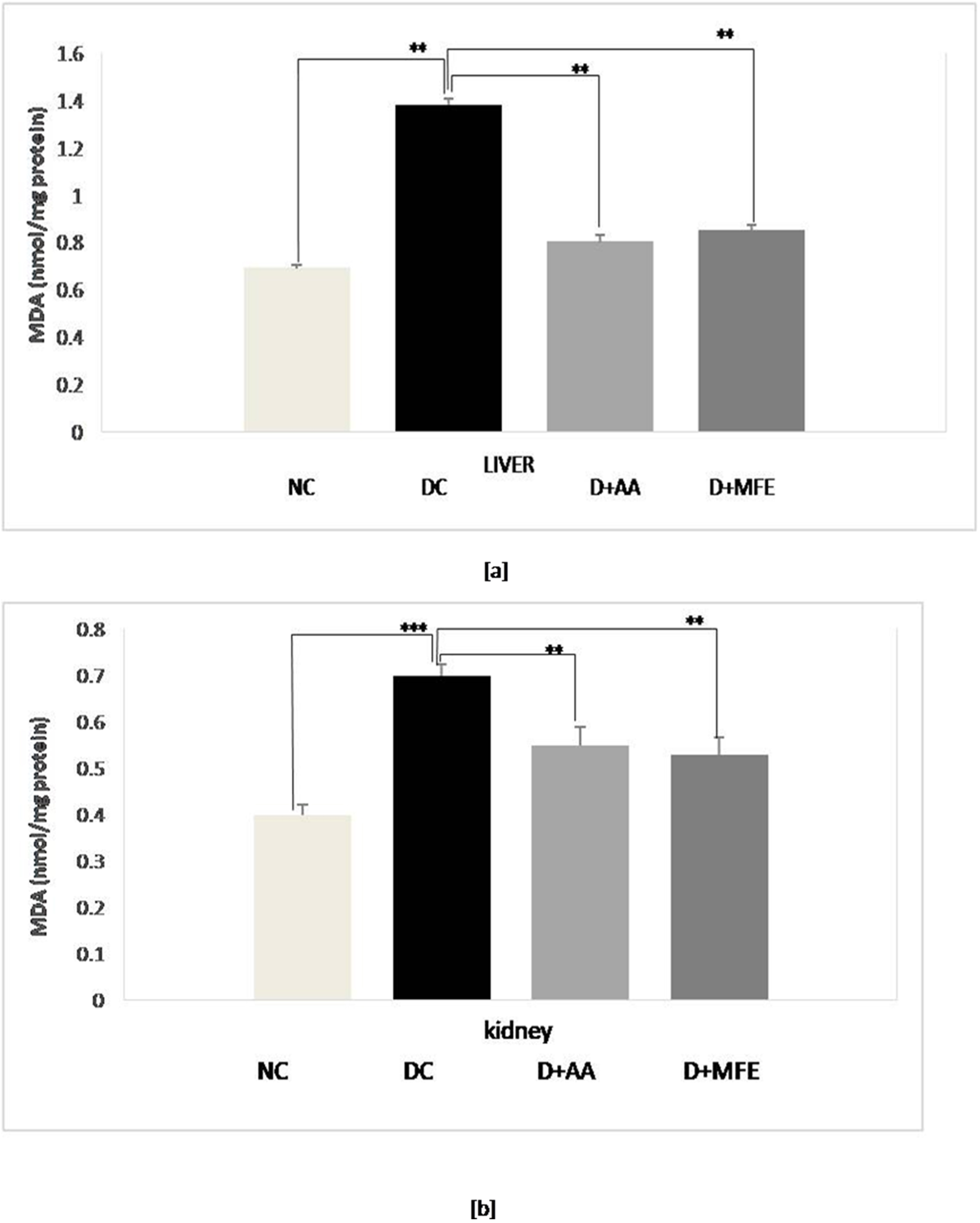 Fig. 3.Mean levels of malondialdehyde (MDA) in the liver tissue (a) and mean levels of MDA in kidney tissue (b) of normal control (NC), diabetic control (DC), diabetic mice treated with ascorbic acid (D+AA), diabetic mice treated with MFE (D+MFE). Values represent the mean