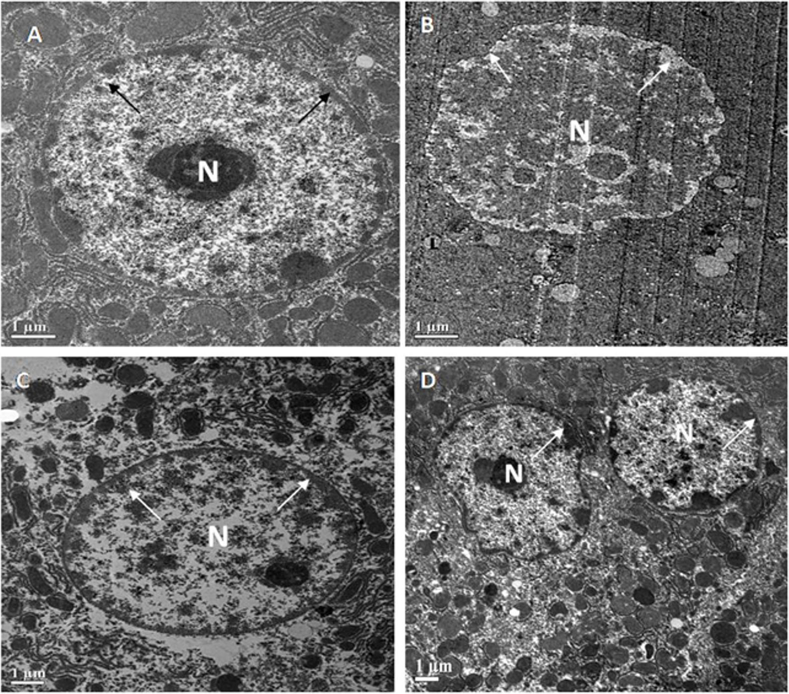 The livers of all four groups of Swiss albino mice are depicted in electron micrographs in Fig. 4. A round or oval-shaped nucleus with prominent nucleoli and a symmetrical nuclear membrane was detected in the standard control (A). The diabetic control, on the other hand, had an unevenly shaped nucleus (N) with nearly dissolved nucleoli and an uneven nuclear membrane (B). MFE and ascorbic acid treatment, on the other hand, had an almost identical impact in correcting hepatic abnormalities in both treated groups near normal (oval to round) nucleus (N), with approximately symmetrical nuclear membrane, though some places had uneven nuclear membrane (C,D).