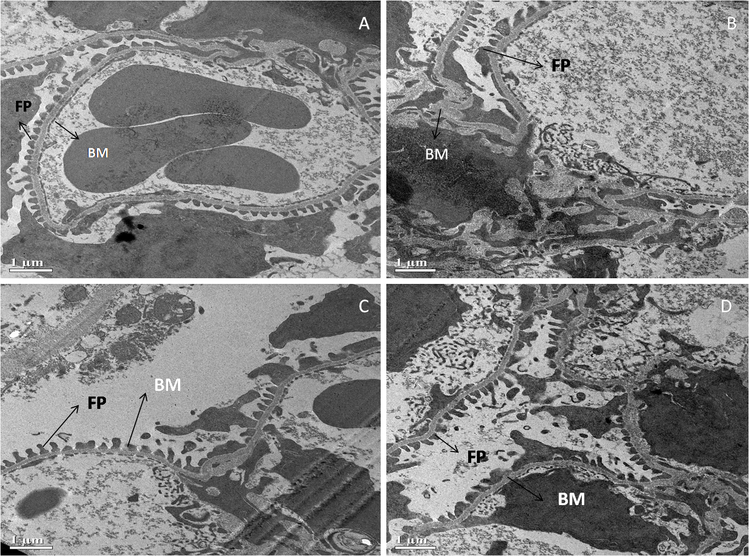 Fig. 5 shows an electron micrograph of the kidneys of all four groups of Swiss albino mice. Renal corpuscles with normal extended foot processes (F.P.) lying on the symmetrical glomerular basement membrane (B.M.) were seen in the standard control (A). In diabetic control, however, the ultrastructure of the renal corpuscle was altered, as evidenced by long and aberrant foot processes and abnormal thickening of the glomerular basement membrane (B). Surprisingly, diabetic mice treated with MFE and ascorbic acid had decreased thickening of the glomerular basement membrane (B.M.) and foot processes (F.P.) that were practically normal (C, D).