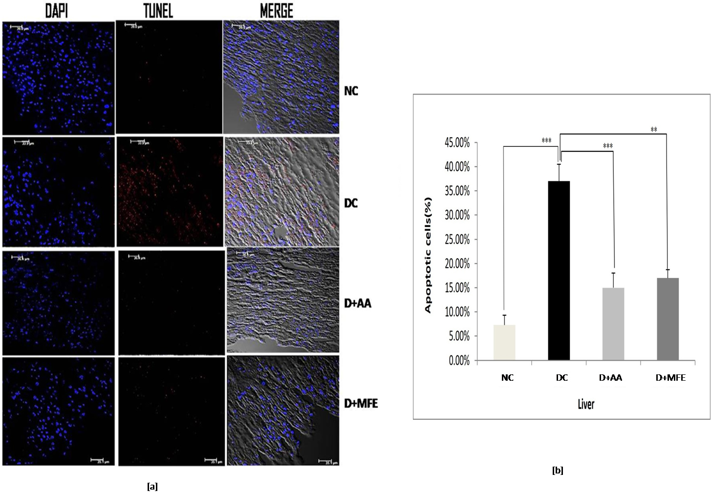 The TUNEL assay was used to investigate the influence of MFE on apoptosis morphologically using the TUNEL staining method. The percentage of apoptotic cells in the tissues was calculated as follows: