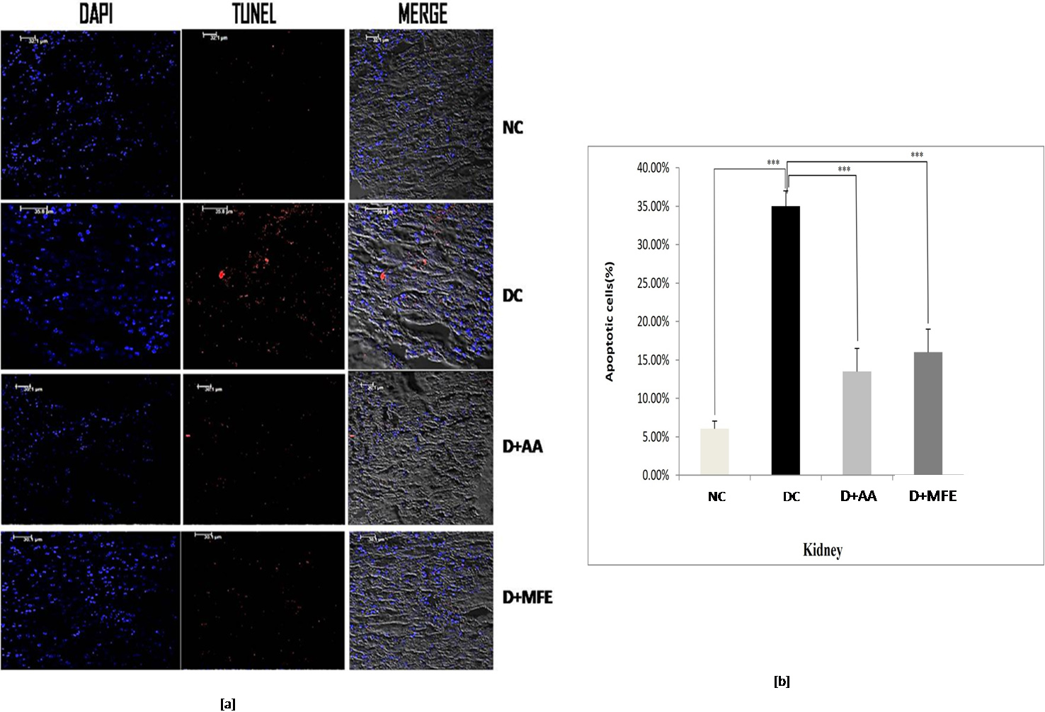 The percentage of TUNEL-positive cells in diabetic control kidney tissue, as depicted in Fig. 7a,b, was 35%, compared to 6.5% in normal control kidney tissue. When compared to diabetic control in the study, ascorbic acid, and MFE treatment were effective in reducing apoptotic cell death, as TUNEL-positive cells were determined to be 13% and 16%, respectively.