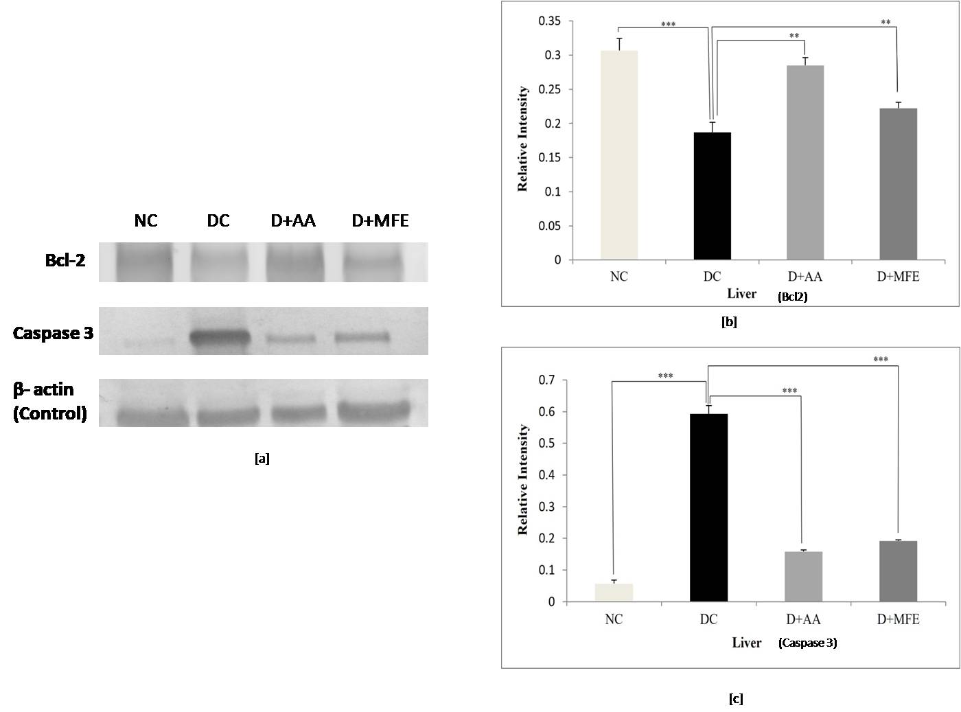 It has been established that under hyperglycemia-induced oxidative stress, various cell types undergo a ubiquitous phenomenon known as apoptosis (cell death) [42]. A characteristic feature of apoptotic cell death is DNA strand breakage. This study used the TUNEL assay to detect apoptotic cells because the TUNEL reaction preferentially labels DNA strand breaks generated during apoptosis. The study found a substantial number of TUNEL-positive cells and a 37% and 35% increase in apoptotic cells in the liver and kidney, respectively, in the diabetic state caused by alloxan. However, administration of ascorbic acid and MFE lowered the number of TUNEL-positive cells in diabetic mice’s liver and kidney tissues, indicating reduced apoptosis. As a result, the findings of the TUNEL assay may be corroborated by the study’s western blot analysis of apoptosis-associated proteins.