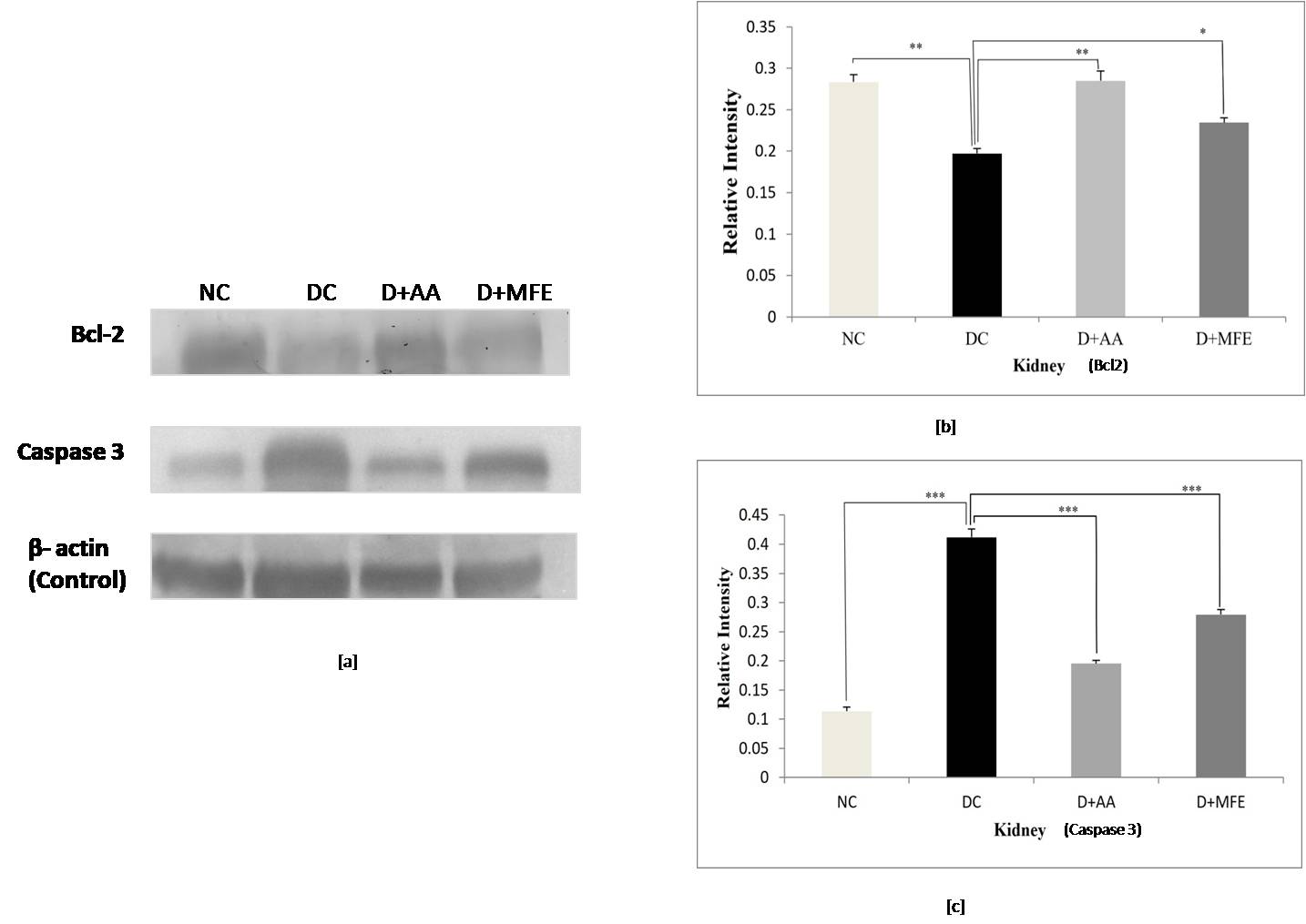 To observe the effect of MFE apoptotic cell death, caspase three and Bcl-2 protein expression in mice’s hepatocytes and renal tissues were studied. In the current study, diabetic mice had lower Bcl-2 expression and higher caspasethree3 expressions. Diabetic mice treated with ascorbic acid and MFE showed reduced caspase three expressions and increased Bcl-2 expression. Thus, the study’s TUNEL assay and western blot analysis results indicate the anti-apoptotic nature of MFE against hyperglycemia-induced oxidative stress apoptosis. However, ascorbic acid was taken as a positive control for conducting all the experiments. A similar outcome was observed, implying that ascorbic acid could be the active compound, as its presence was confirmed in the HPTLC method.