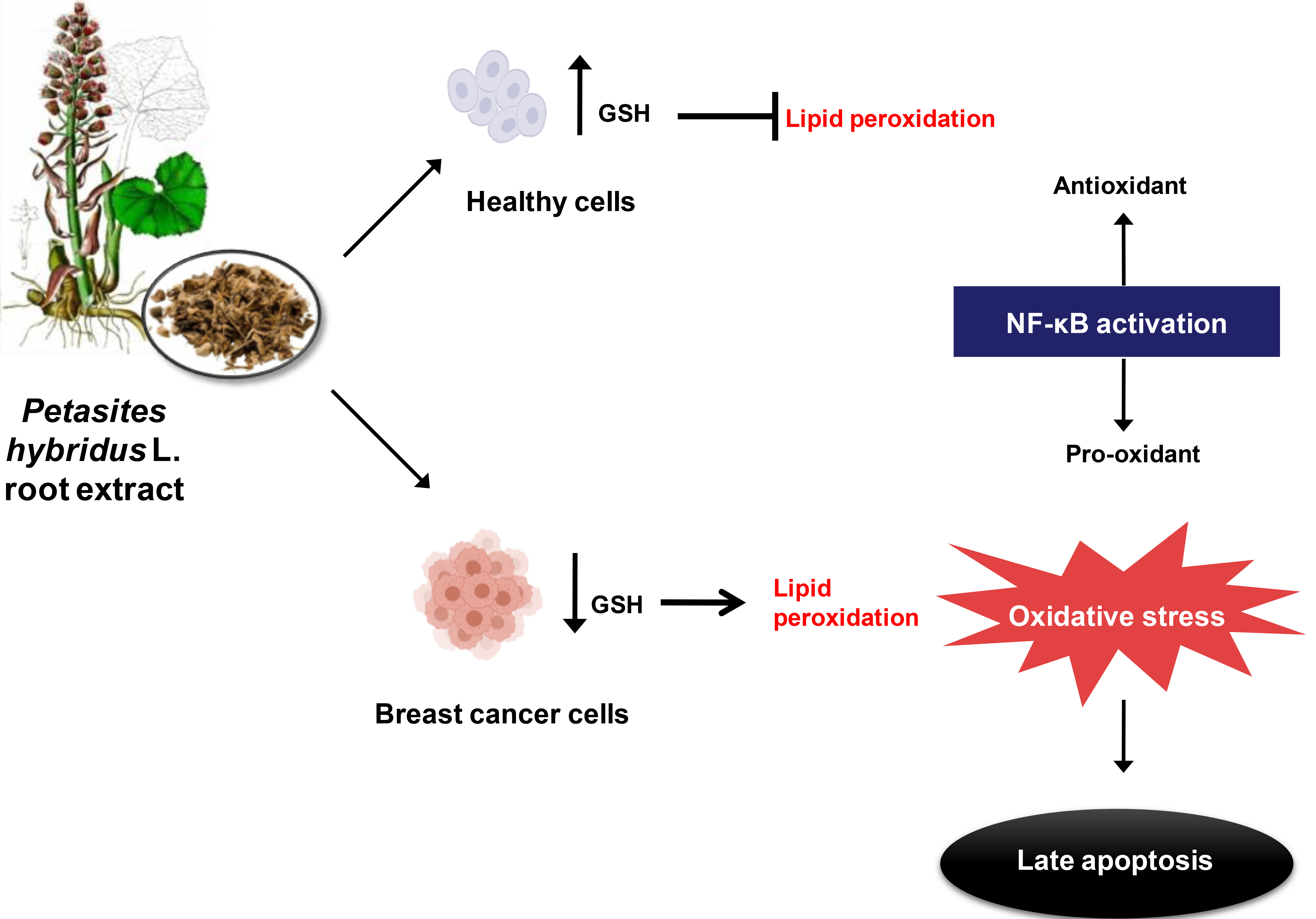 In sum, results obtained indicate that Petasites hybridus L. root extract acts as pro-oxidant, inducing oxidative stress specifically in MDA-MB-231 cells. In contrast, in non-cancerous MCF10A cells oxidative stress is alleviated due, in part, to a compensatory increase in the GSH antioxidant defense system. Therefore, these findings suggest that butterbur extract triggers a late apoptotic response in human breast cancer cells as result of oxidative stress, and this response is accompanied by increased lipid peroxidation and GSH depletion.
