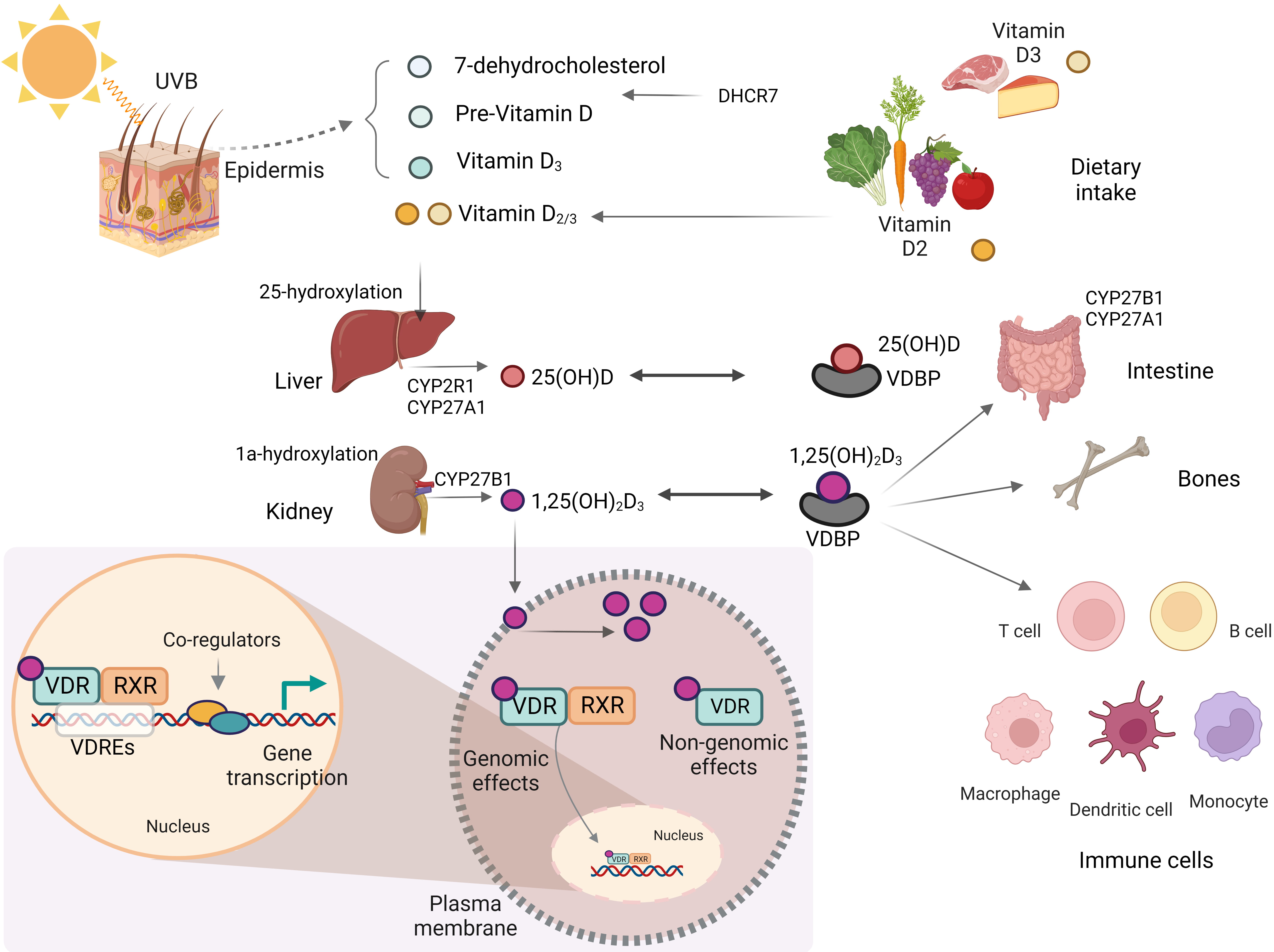 Fig. 1.Biosynthesis and metabolism of vitamin D. This figure was created using BioRender (https://biorender.com, accessed February 13, 2023). UVB, ultraviolet B; CYP2R1, cytochrome P450, family 2, subfamily R, polypeptide 1; CYP27A1, cytochrome P450, family 27, subfamily A, polypeptide 1; CYP27B1, cytochrome P450, family 27, subfamily B, polypeptide 1; VDR, vitamin D receptor; VDRE, vitamin D response element; RXR, retinoid X receptor; DHCR7, 7-dehydrocholesterol reductase; VDBP, vitamin D-binding protein.