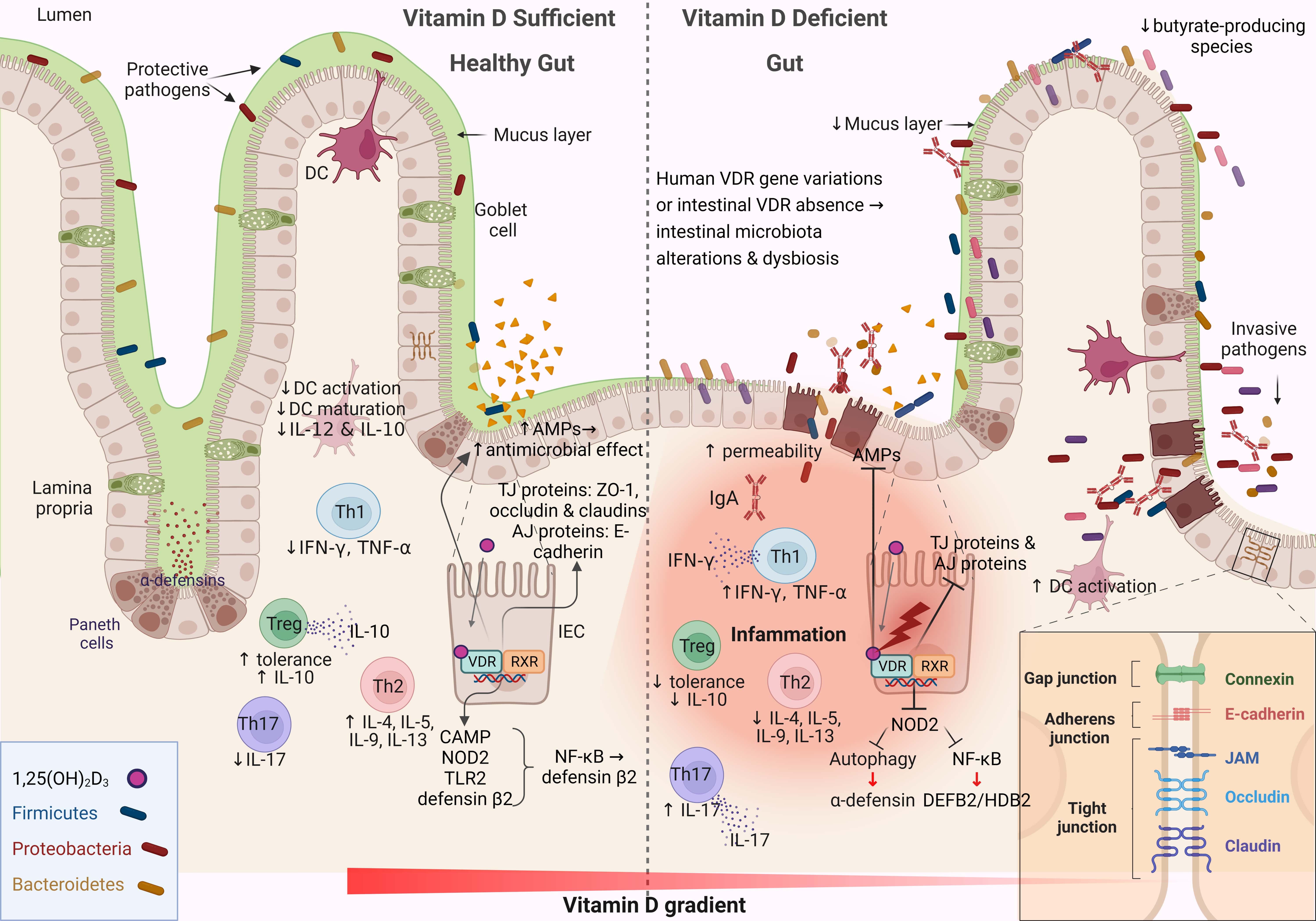 Vitamin D/vitamin D receptor (VDR) signaling contributes significantly to the immunological, genetic, environmental, and microbial aspects of human health and disease [8, 9]. The human VDR is the first identified gene that functions as an essential host factor and genetically influences the modulation of the gut microbiome [10]. Several studies have demonstrated the crucial function of vitamin D and its receptor in maintaining a healthy gut [11, 12].