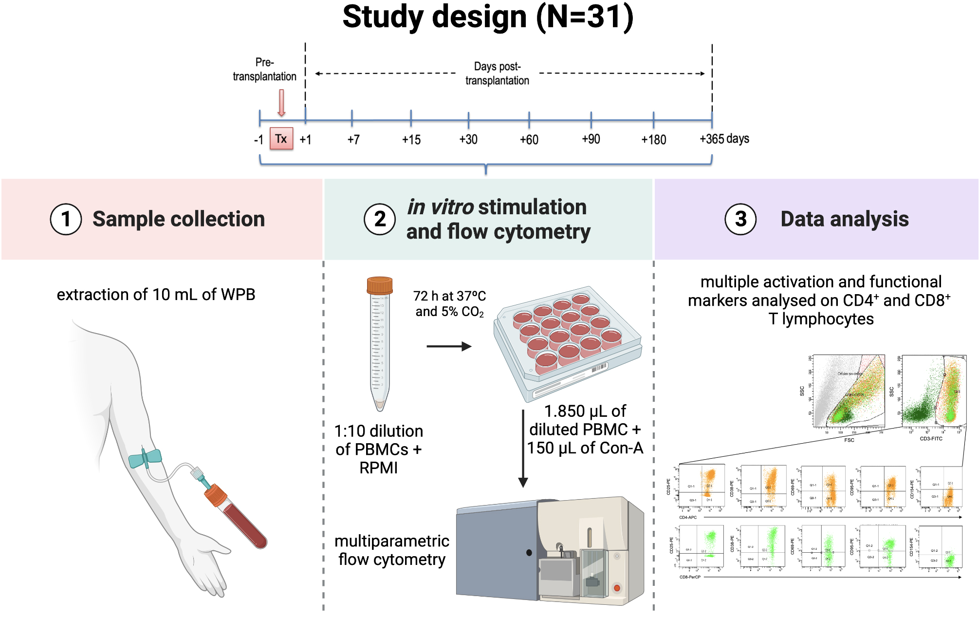 Fig. 1.Study design. Kidney transplant recipients enrolled in this prospective observational study were appointed for sample collection at different time points during the first-year post-transplantation. Following blood extraction, samples were activated in vitro using polyclonal stimulus to assess T lymphocytes for several surface markers using multi-parametric flow cytometry.