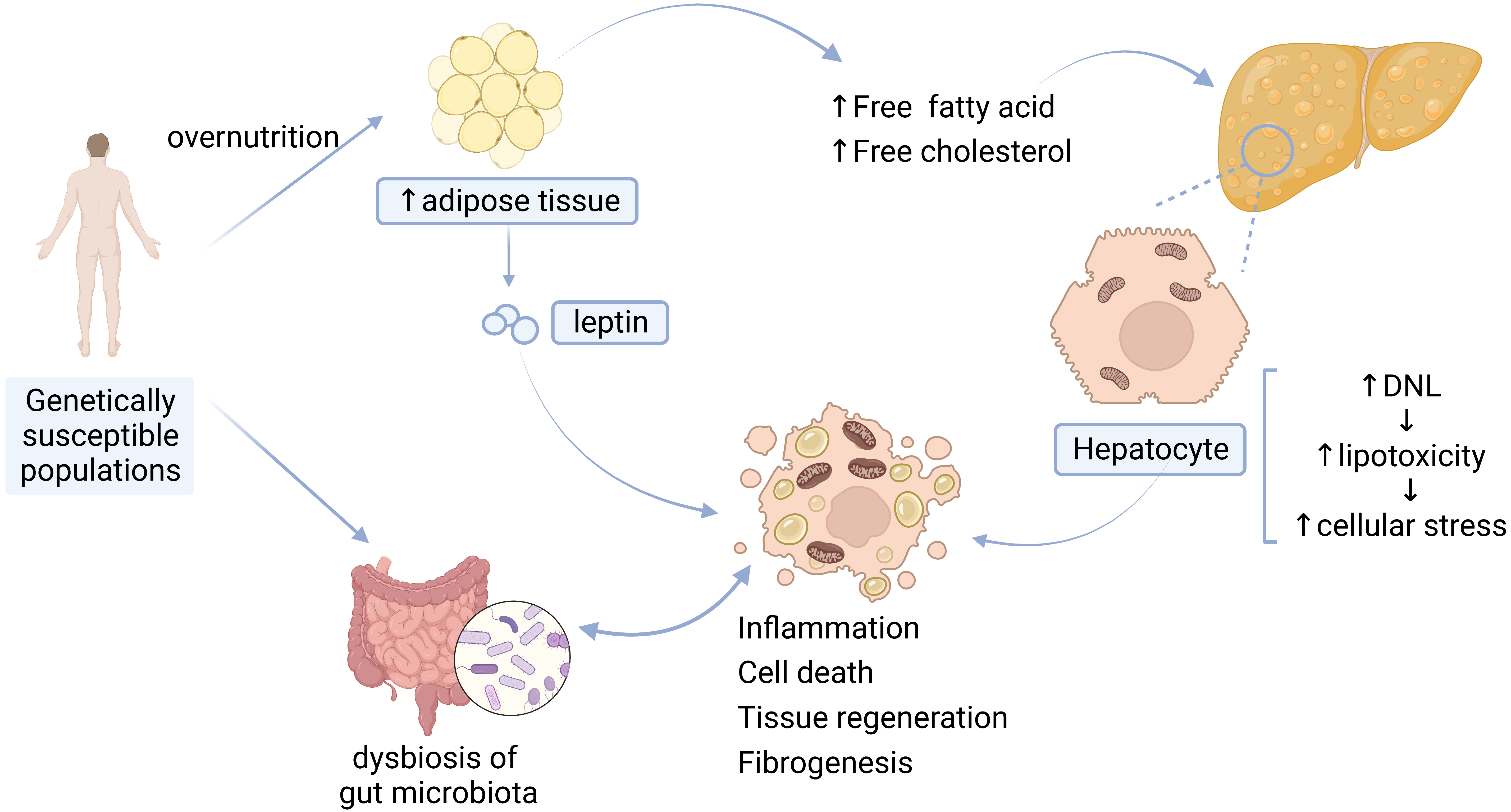 The main driver of NAFLD is overnutrition, which leads to the excessive accumulation of adipose tissue in the liver and exceeds the liver’s metabolic capacity [2]. Accumulation of high levels of free fatty acids (FFA), free cholesterol, and other lipid metabolites leads to increased lipotoxicity [10], further contributing to cellular stress such as oxidative stress and endoplasmic reticulum (ER) stress [2], production of reactive oxygen species (ROS), mitochondrial dysfunction [10, 11], inflammasome activation [12], and apoptotic cell death, and subsequent inflammatory stimulation, tissue regeneration, and fibrogenesis [2].