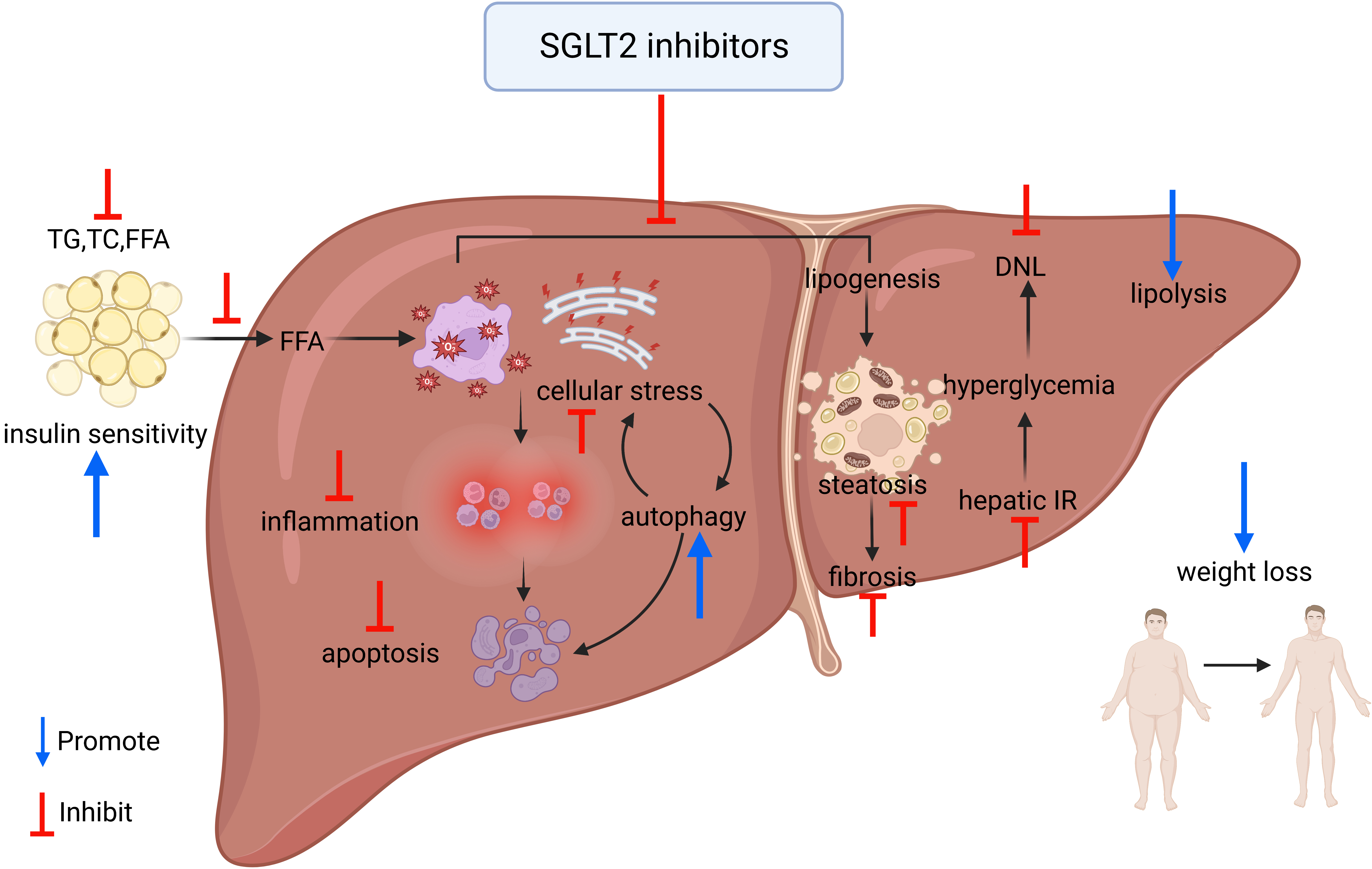 Inflammation activation participates in the development of NAFLD and NASH; studies suggest that SGLT-2 inhibitors also can inhibit the process of inflammation and thereby alleviate liver steatosis and fibrosis.