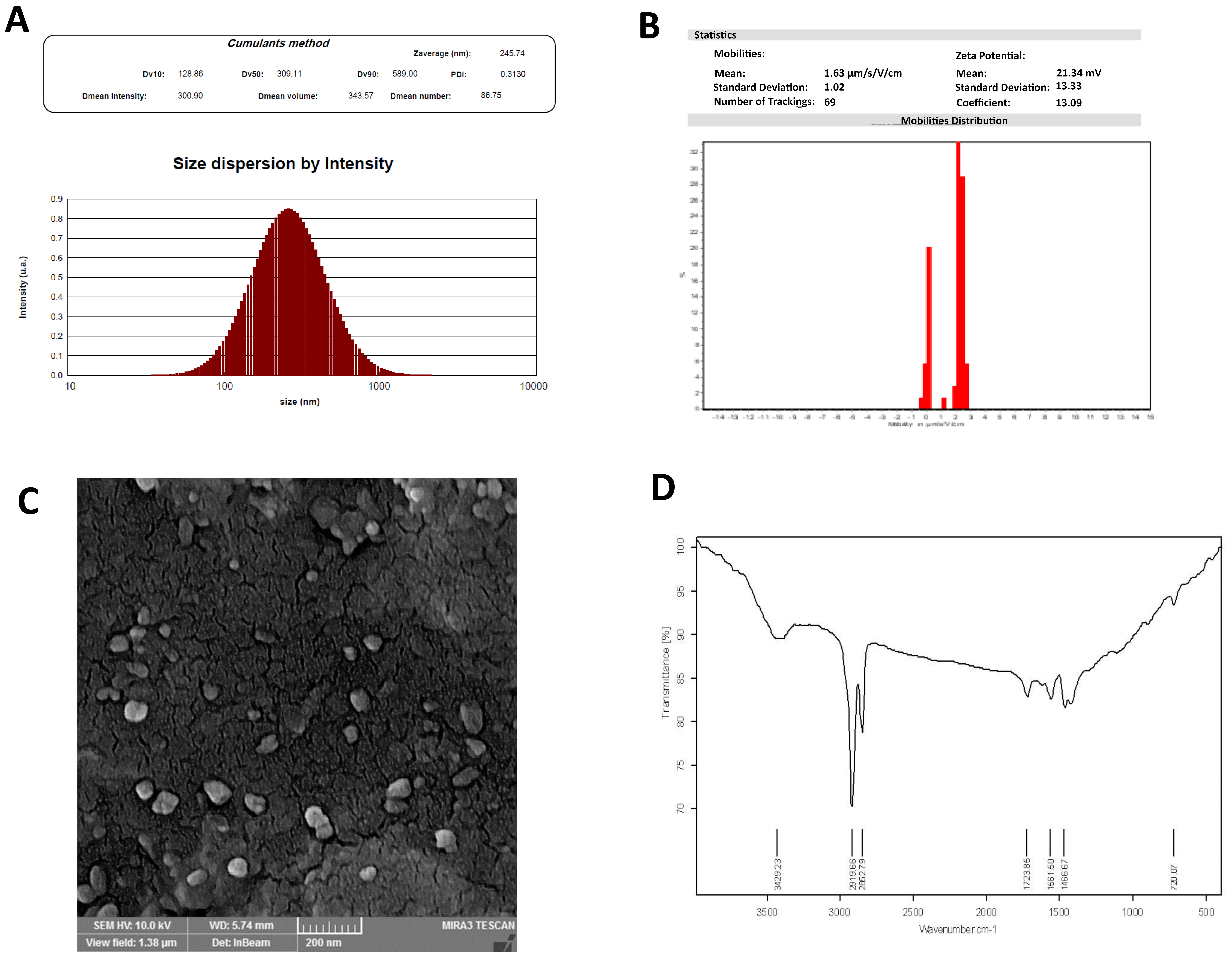 Fig. 1.Characterization of AC-SLN-CS-FA. (A) Results for size. (B) Results for zeta-potential of AC-SLN-CS-FA. (C) FESEM image of AC-SLN-CS-FA; and (D) FTIR spectrum of AC-SLN-CS-FA. PDI, polydispersity index.