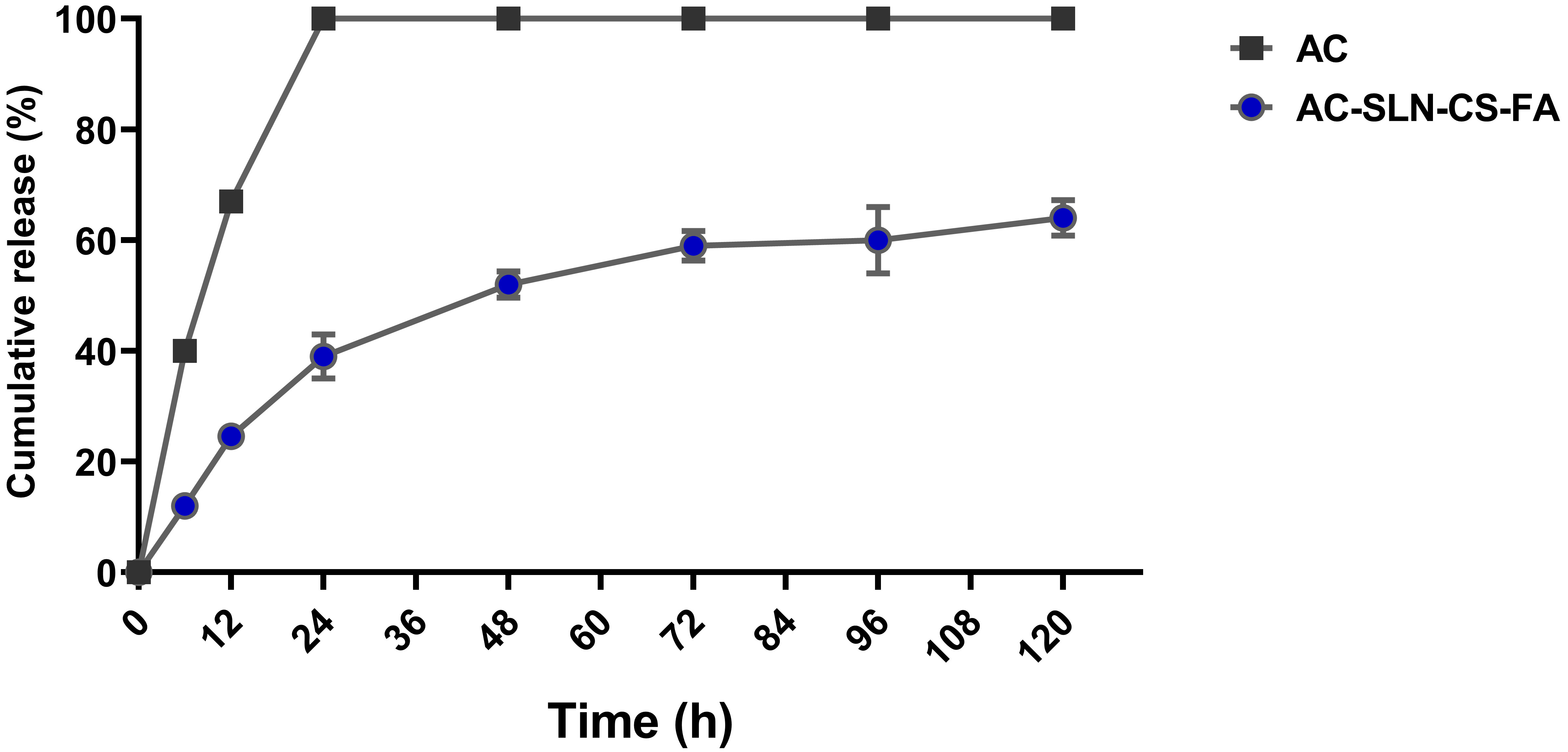 The encapsulation efficiency of the drug in SLNs is related to the crystalline state of the formulation and the composition of its lipid matrix. In the present study, this index was reported to be 83% for AC, which is comparable to previous studies [42, 43, 44]. Successful encapsulation of AC in SLNs can be related to the hydrophobic nature of AC and its high binding energy to the lipid matrix of SLNs [45]. The most valuable indicators of a drug delivery system are the drug loading percentage and the controlled release in the body. The amount of drug loading depends on various factors, including the materials used in the formulation, the type of drug, and its nature [26]. The present study has reported the drug release index as burst propagation followed by slow release (Fig. 2). This burst release can be attributed to the presence of unencapsulated drug molecules at the SLN level or in the peripheral dispersion of the formulation [22]. The prolonged release of the AC from AC-SLN-CS-FA compared to free AC indicated the entrapment of AC in all parts of the formulation. The AC release index generally showed a slow and long-term release, and this pattern can reduce the need for high doses of drug by maintaining the drug concentration for a long time [46].