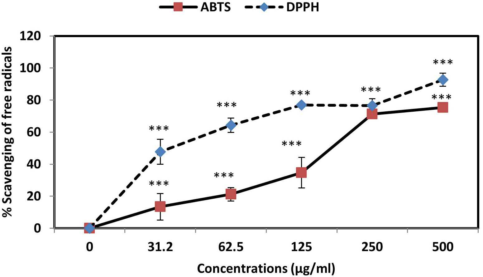 Fig. 3.Percentage inhibition of ABTS and DPPH free radicals in the