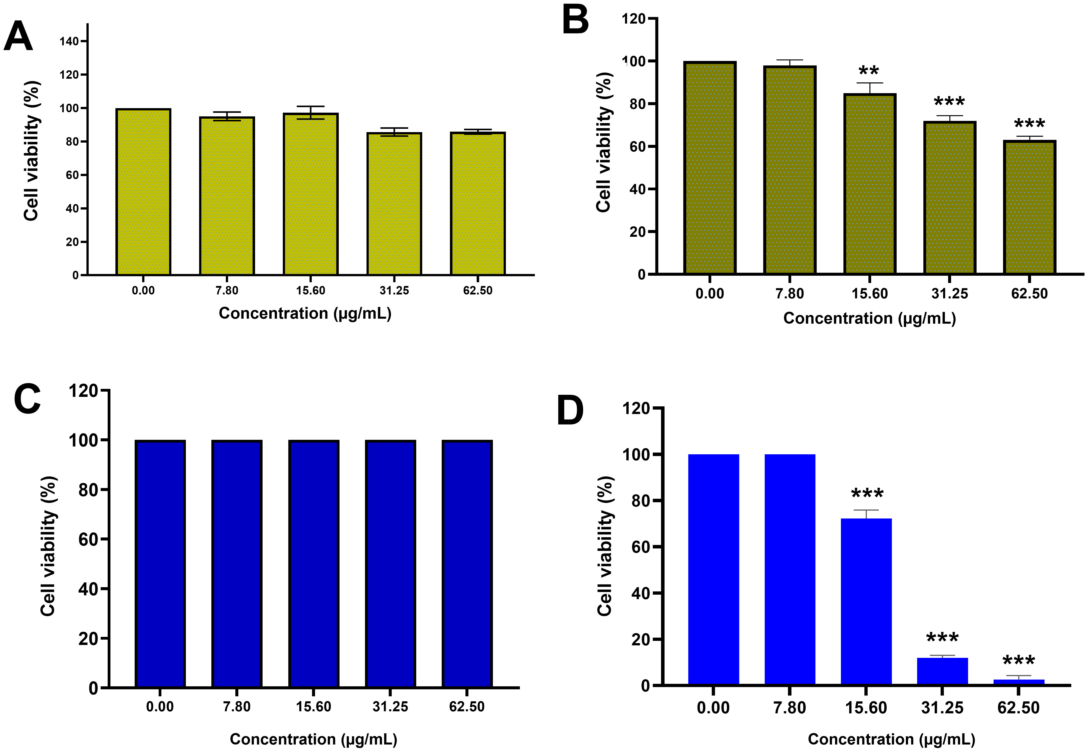Fig. 4.Cytotoxicity study. MTT results: (A) Cytotoxicity effects of AC against HFF cells;