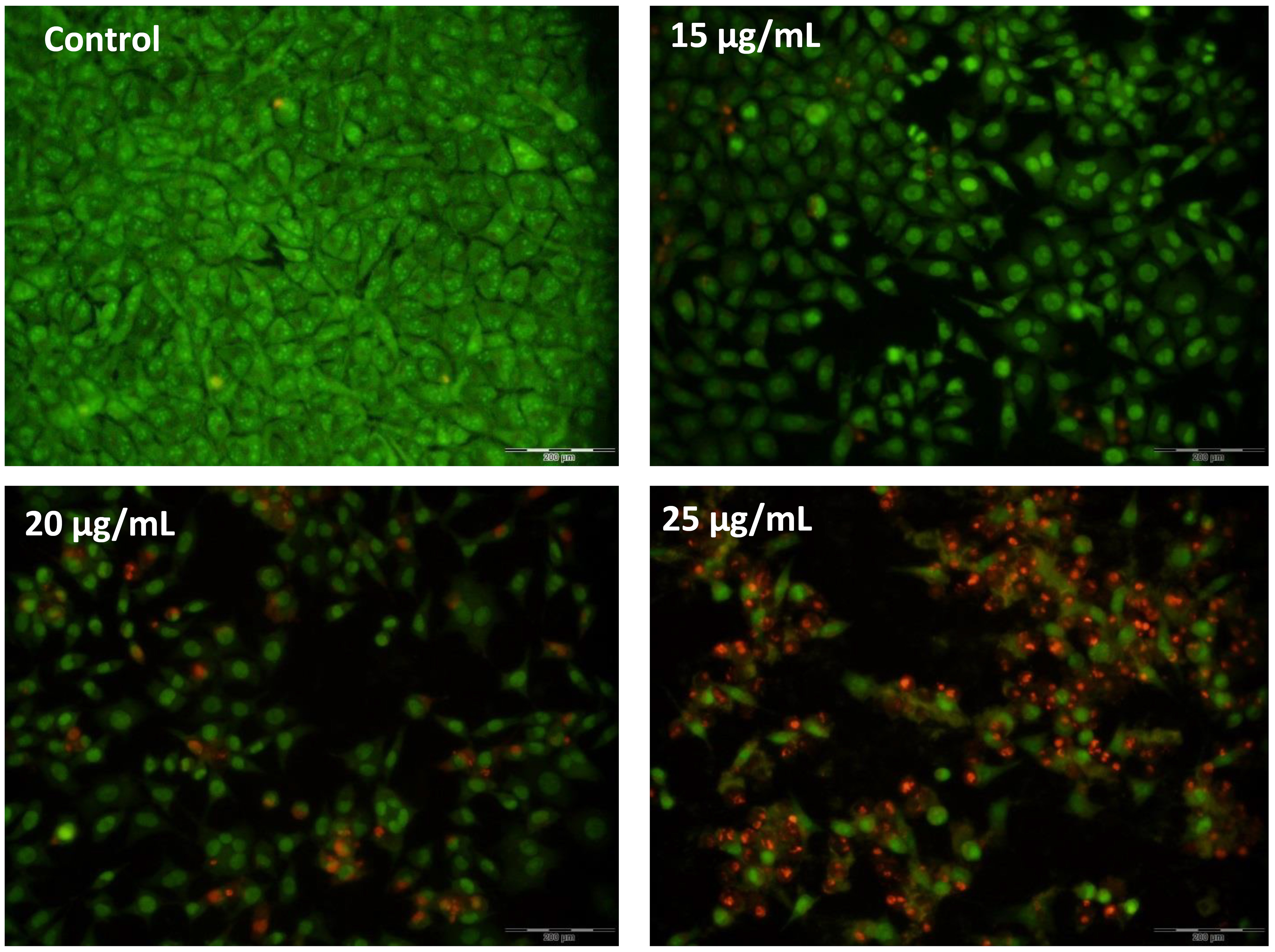 For staining, cells were first cultured in 6-well plates, and then, treated with different concentrations of AC-CFS-NPs. After the treatment period, the treatment medium was drained and 1 mL of PBS containing AO (1 µL; 1 mg/mL) and PI (1 µL; 1 mg/mL) dye was added to each well. Finally, images of the cells were taken using a fluorescent inverted microscope.