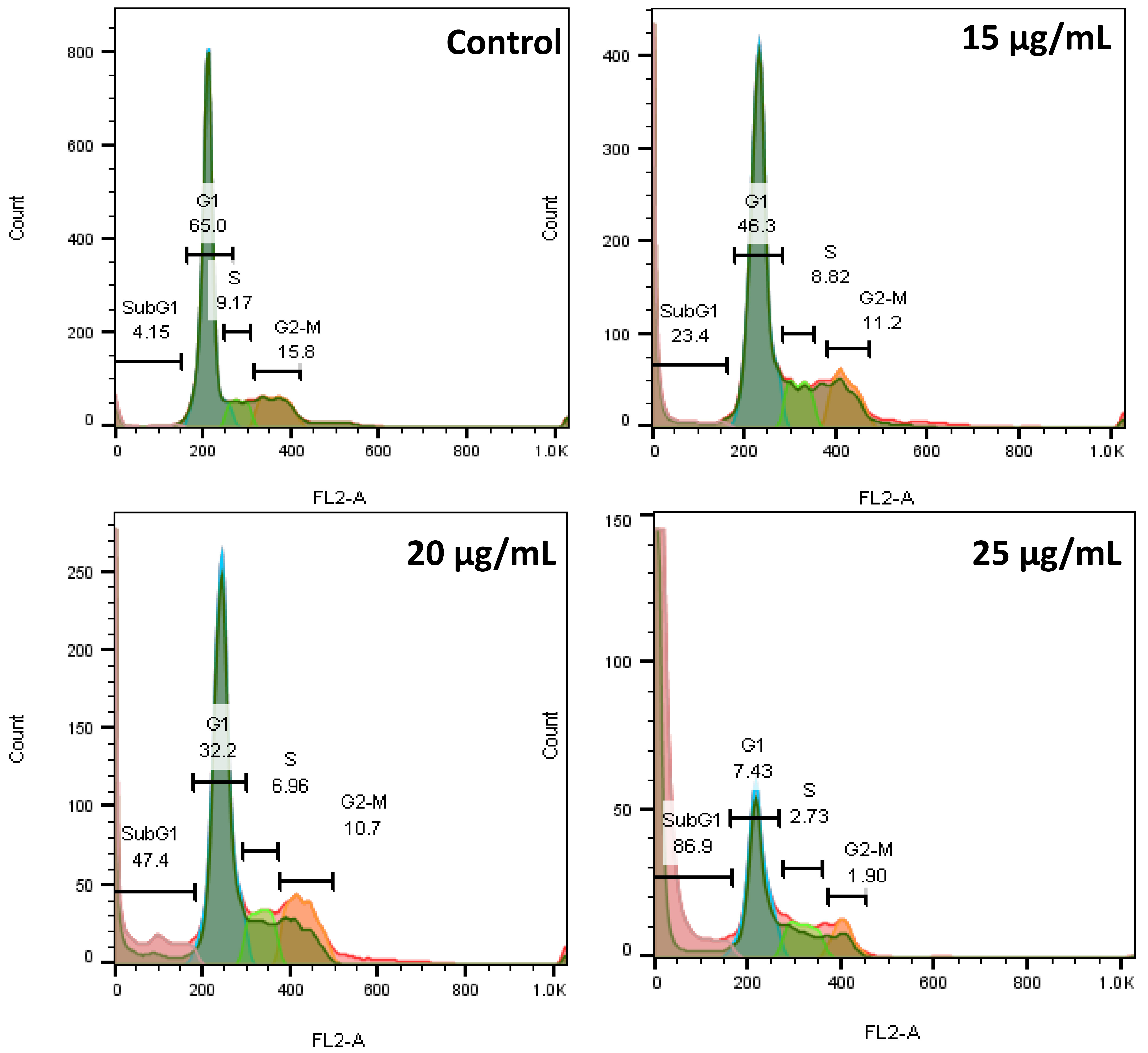 Fig. 6.The flow cytometry diagram shows the cells arresting in the sub-G1 phase after treatment with AC-CFS-NPs.