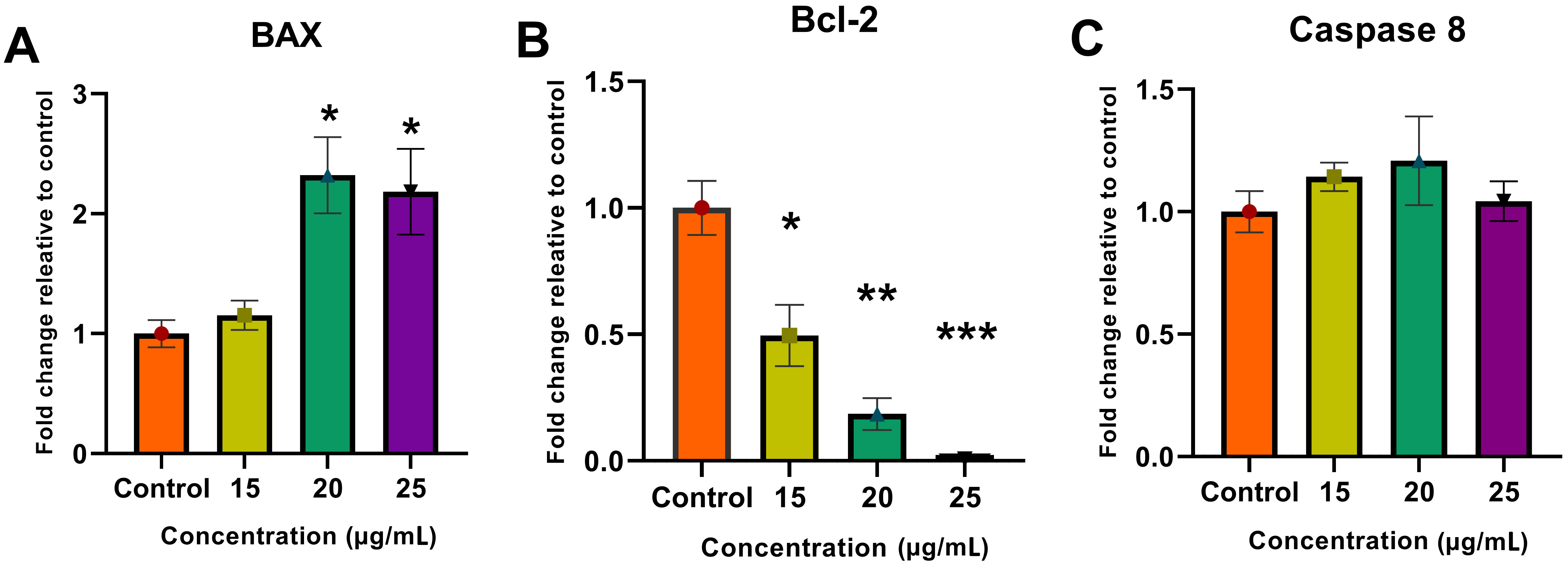 The results of the RNA analysis showed a change in BAX and Bcl-2 gene expressions, leading to the activation of the internal apoptotic pathway. Upregulation of the BAX gene and downregulation of Bcl-2 represents the activation and suppression of pro- and antiapoptotic genes, respectively, thereby indicating the induction of apoptosis in the treated cells. The extrinsic apoptotic pathway was investigated by analyzing caspase 8 gene expression levels. The caspase 8 expression levels showed no significant change compared to the control, which indicates the inactivity of the external pathway and the occurrence of apoptosis from the internal pathway (Fig. 7).