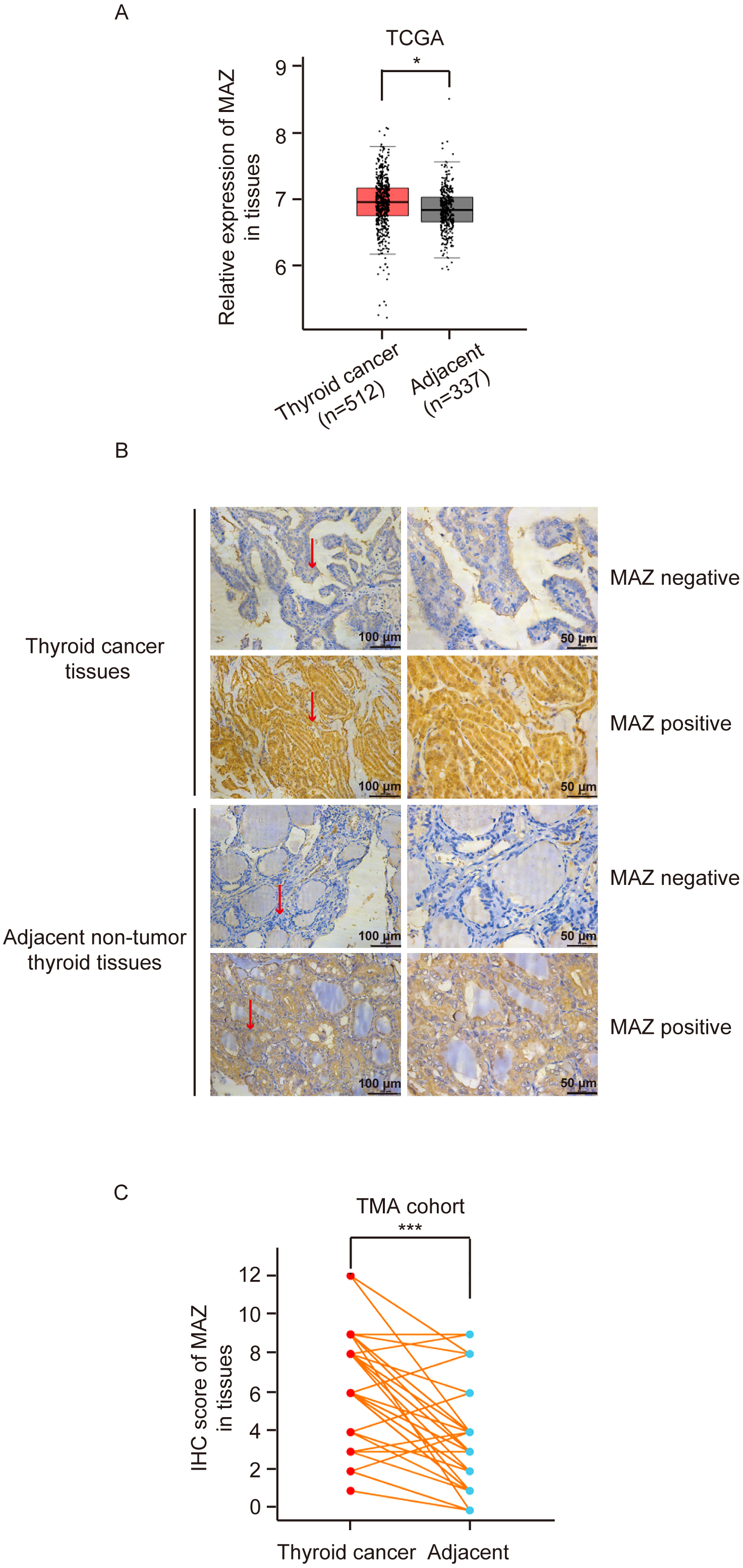 MAZ in thyroid cancer and adjacent tissues in TCGA database. (B) Representative