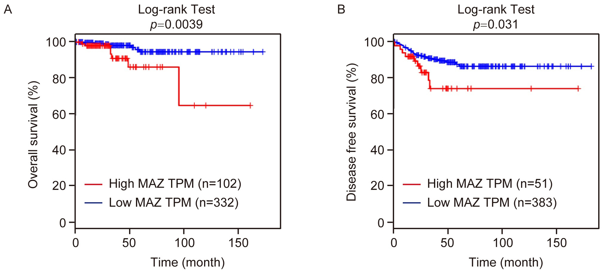 Fig. 2.Relationship between MAZ expression and thyroid cancer prognosis. (A) Kaplan-Meier plotter analysis of OS and (B) DFS of MAZ was conducted in patients with thyroid cancer. TPM, transcripts per million
