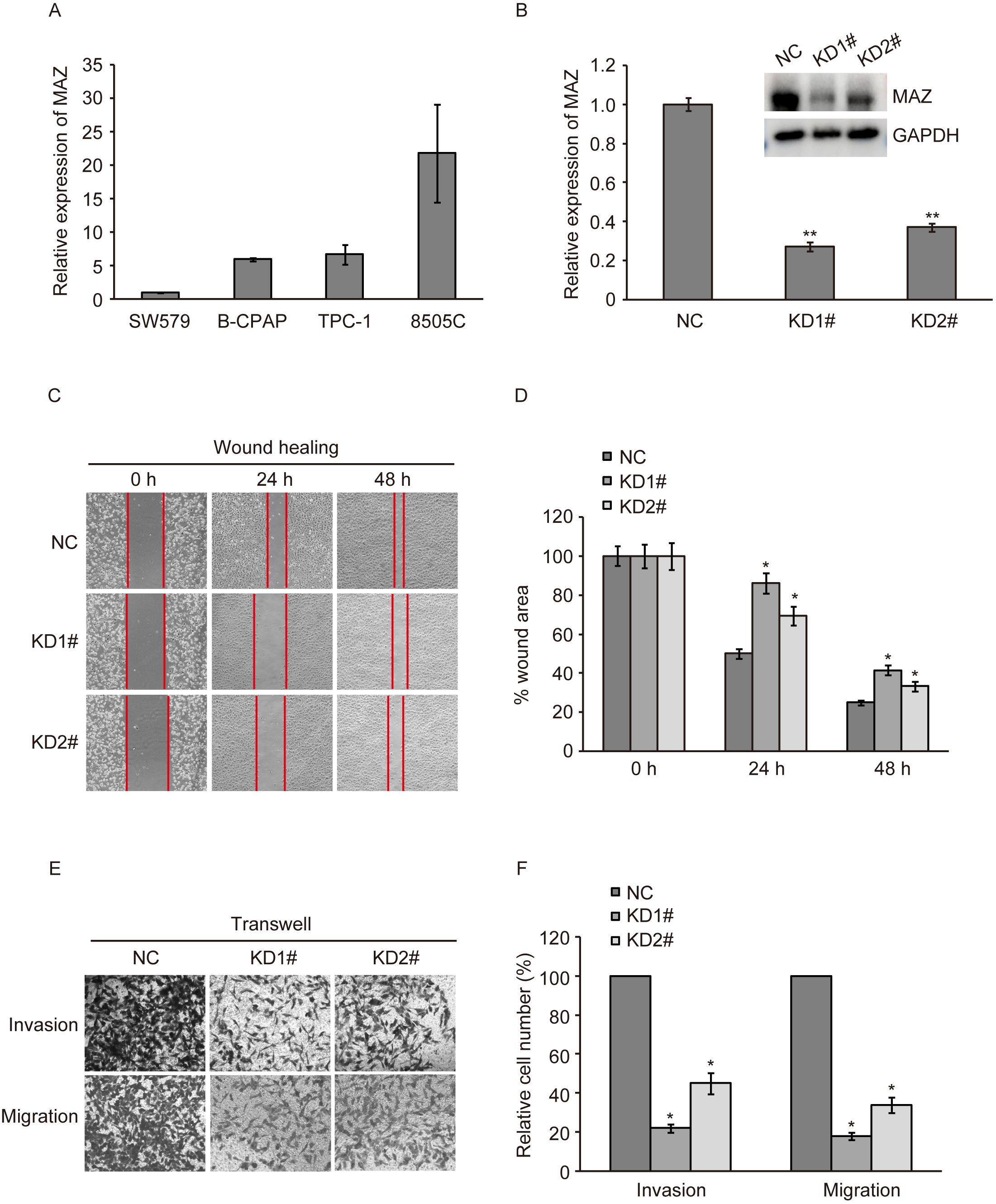 Fig. 3.Role of MAZ in metastasis of thyroid cancer. (A) RT-qPCR