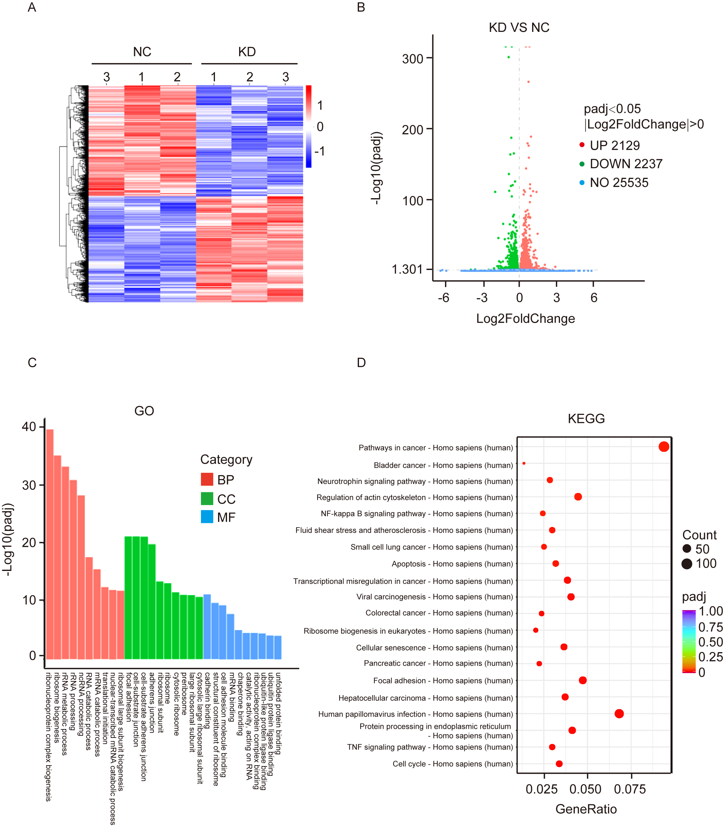 Fig. 4.RNA-seq results of MAZ knockdown thyroid cancer cells. (A) Heatmap of the differentially expressed genes (DEGs). (B) Volcano plot. (C) The Gene Ontology (GO) enrichment analysis. (D) The Kyoto Encyclopedia of Genes and Genomes (KEGG) enrich distribution point diagram. BP, biological process; CC, cell component; MF, molecular function.