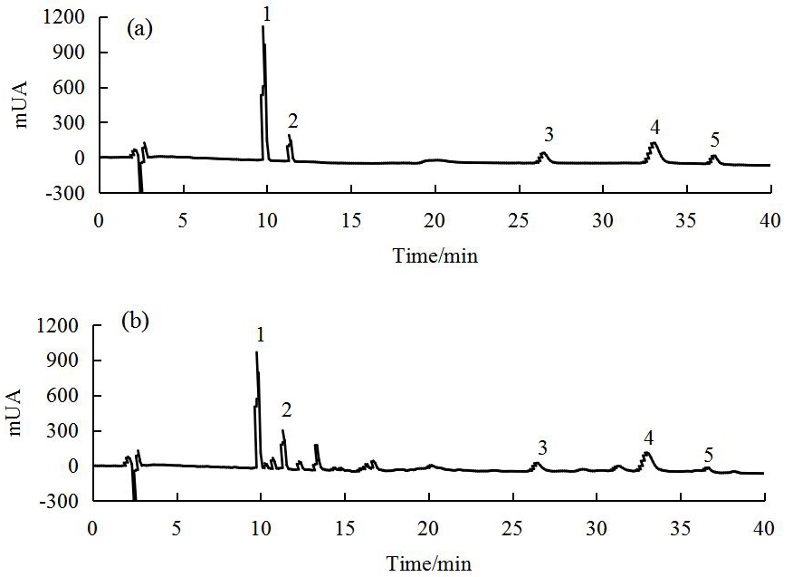 Fig. 2.RP-HPLC-DAD profiles of mixed standards (a) and SCO (b) (The numbers in the profiles: 1. schisanol A, 2. schisanol B, 3. schisanin A, 4. schisanin B, 5. schisanin C).