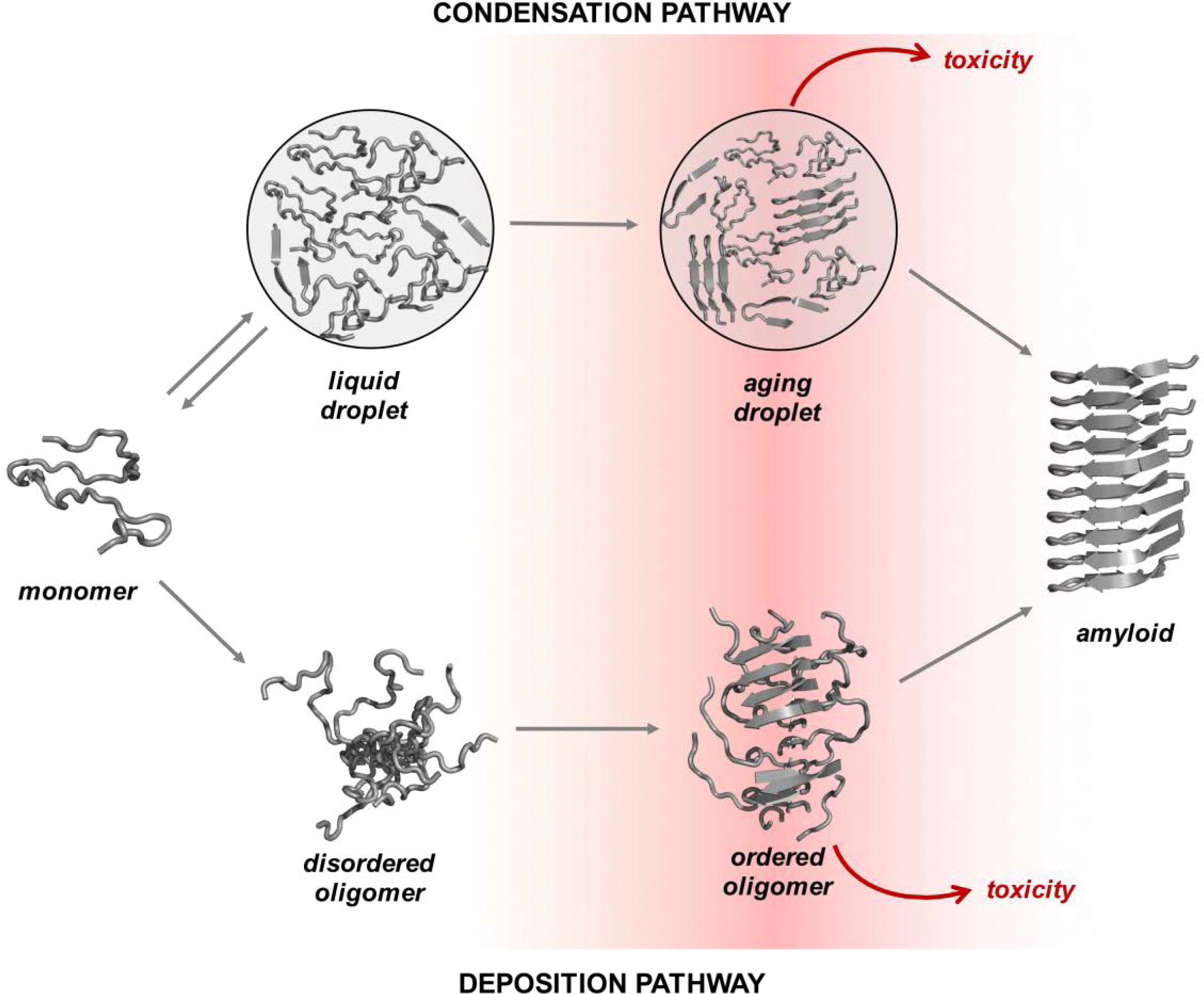 The transition between the native and amyloid states of proteins can proceed via oligomeric intermediates as described above or via a condensation pathway involving liquid droplet intermediates generated through liquid-liquid phase separation [35]. Multivalent weak interactions between peptides are the driving force of phase separation. Proteins that undergo phase separation promote biomolecular condensate formation, which has a significant role in many biological processes. Further, these proteins can be divided into two categories according to their underlying driving force when forming condensates: self-assembling proteins (interacting with the same protein species and whose interactions are mediated mainly by intrinsically disordered regions) and partner-dependent proteins (interacting with different biomolecule species and whose interactions are mediated by multiple modular domains or motifs). Condensate proteome validation revealed that partner-dependent proteins are widespread in cells [36].